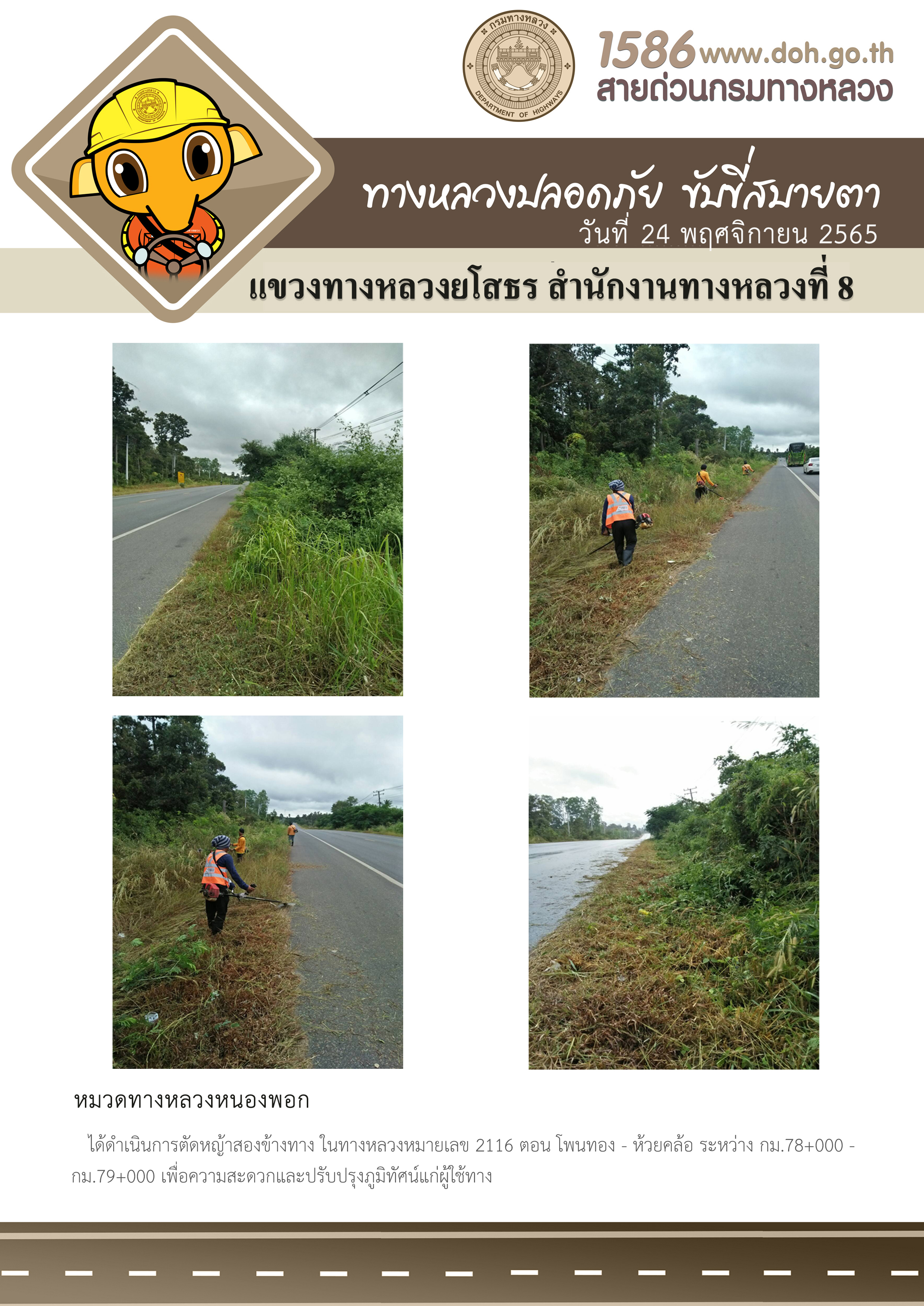 วันที่ 24 พฤศจิกายน 2565 หมวดทางหลวงหนองพอก ได้ดำเนินการตัดหญ้าสองข้างทาง ในทางหลวงหมายเลข 2116 ตอน โพนทอง - ห้วยคล้อ ระหว่าง กม.78+000 - กม.79+000 เพื่อความสะดวกและปรับปรุงภูมิทัศน์แก่ผู้ใช้ทาง