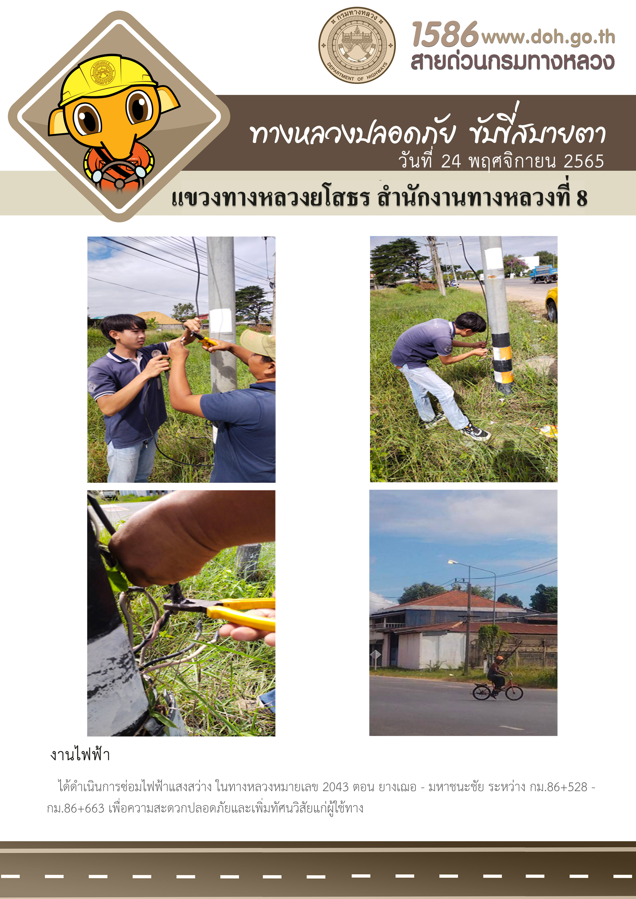 วันที่ 24 พฤศจิกายน 2565 งานไฟฟ้า ได้ดำเนินการซ่อมไฟฟ้าแสงสว่าง ในทางหลวงหมายเลข 2043 ตอน ยางเฌอ - มหาชนะชัย ระหว่าง กม.86+528 - กม.86+663 เพื่อความสะดวกปลอดภัยและเพิ่มทัศนวิสัยแก่ผู้ใช้ทาง