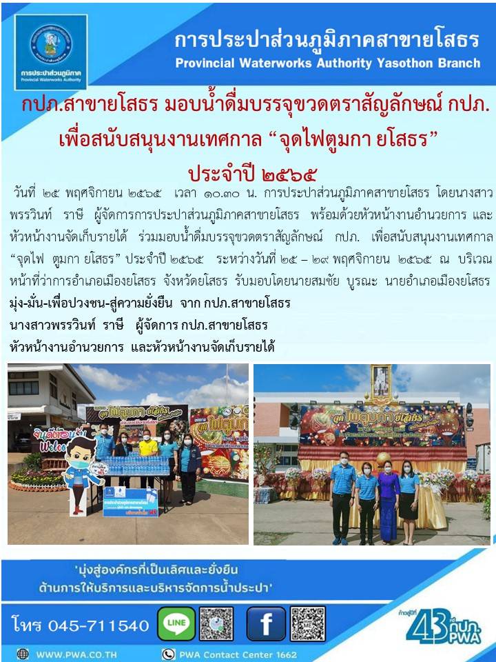 วันที่ 25 พฤศจิกายน 2565 เวลา 10.30 น. การประปาส่วนภูมิภาคสาขายโสธร โดยนางสาวพรรวินท์ ราษี ผู้จัดการการประปาส่วนภูมิภาคกปภ.สาขายโสธร พร้อมด้วยหัวหน้างานอำนวยการ และหัวหน้างานจัดเก็บรายได้ ร่วมมอบน้ำดื่มบรรจุขวดตราสัญลักษณ์ กปภ. เพื่อสนับสนุนงานเทศกาล "จุดไฟ ตูมกา ยโสธร" ประจำปี 2565 ระหว่างวันที่ 25 -29 พฤศจิกายน 2565 ณ บริเวณหน้าที่ว่าการอำเภอเมืองยโสธร จังหวัดยโสธร รับมอบโดยนายสมชัย บูรณะ นายอำเภอเมืองยโสธร