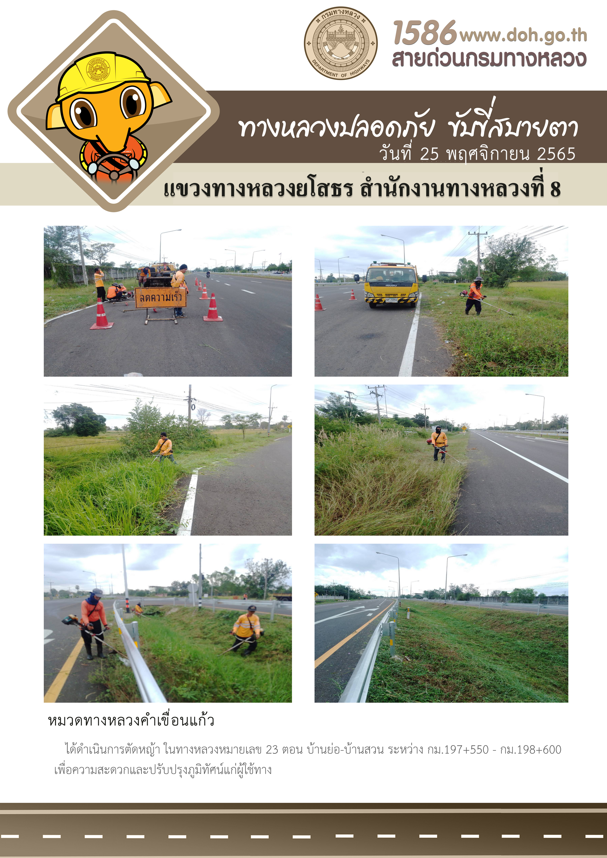วันที่ 25 พฤศจิกายน 2565 หมวดทางหลวงคำเขื่อนแก้ว ได้ดำเนินการตัดหญ้า ในทางหลวงหมายเลข 23 ตอน บ้านย่อ-บ้านสวน ระหว่าง กม.197+550 - กม.198+600 เพื่อความสะดวกและปรับปรุงภูมิทัศน์แก่ผู้ใช้ทาง