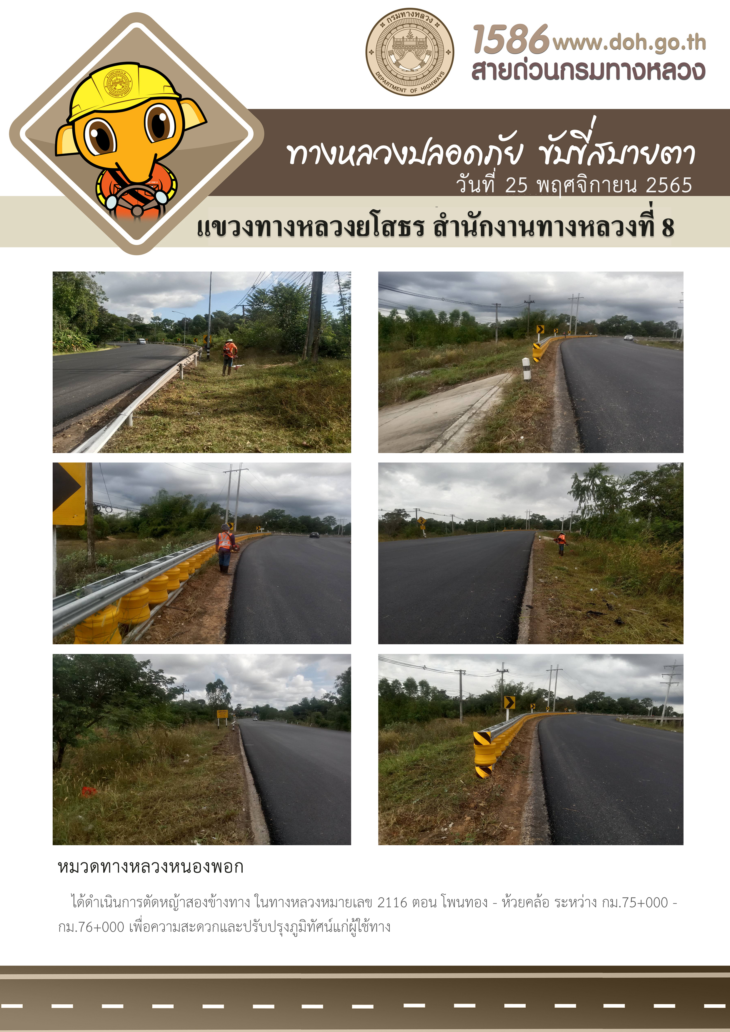 วันที่ 25 พฤศจิกายน 2565 หมวดทางหลวงหนองพอก ได้ดำเนินการตัดหญ้าสองข้างทาง ในทางหลวงหมายเลข 2116 ตอน โพนทอง - ห้วยคล้อ ระหว่าง กม.75+000 - กม.76+000 เพื่อความสะดวกและปรับปรุงภูมิทัศน์แก่ผู้ใช้ทาง