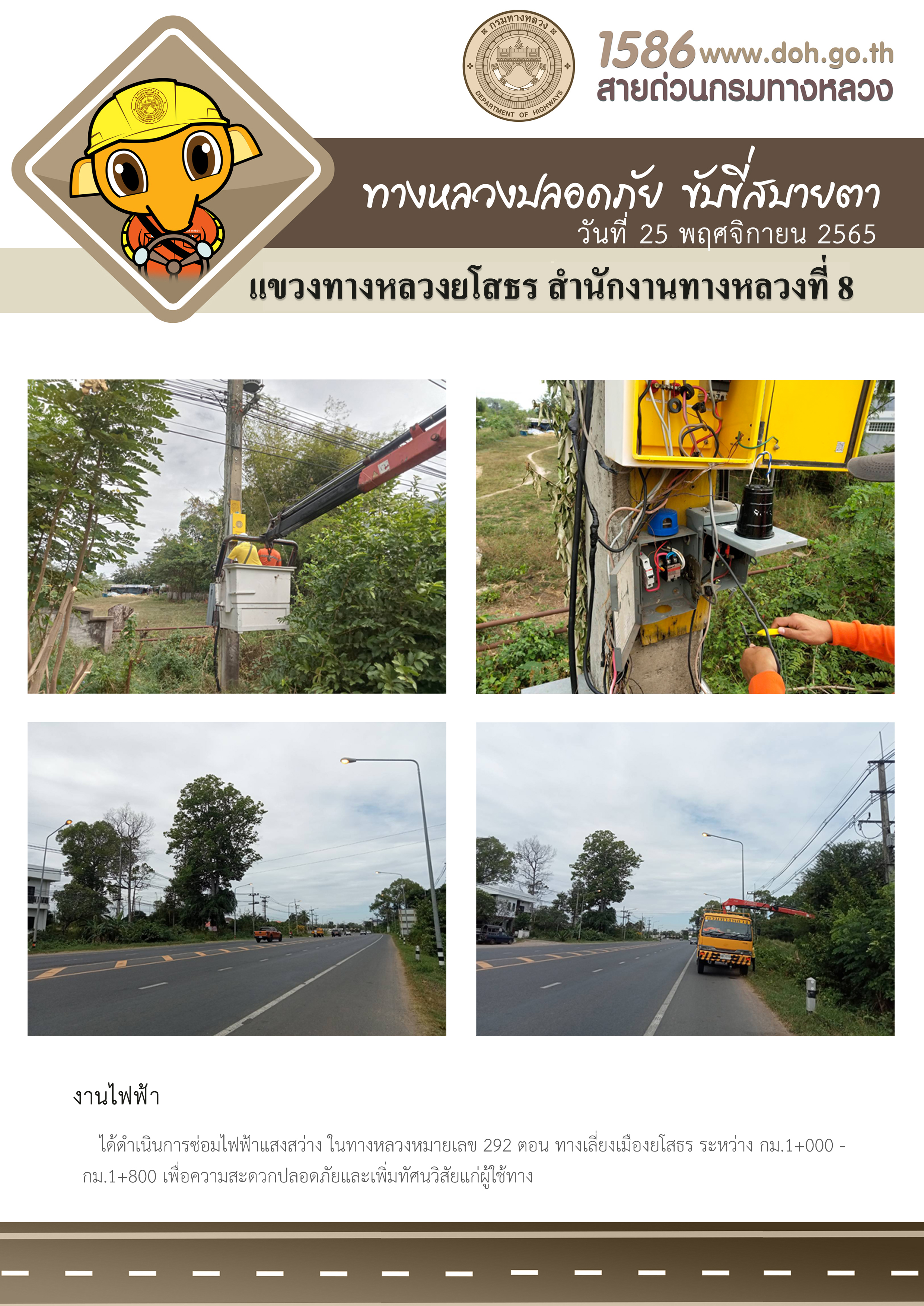 วันที่ 25 พฤศจิกายน 2565 งานไฟฟ้า ได้ดำเนินการซ่อมไฟฟ้าแสงสว่าง ในทางหลวงหมายเลข 292 ตอน ทางเลี่ยงเมืองยโสธร ระหว่าง กม.1+000 - กม.1+800 เพื่อความสะดวกปลอดภัยและเพิ่มทัศนวิสัยแก่ผู้ใช้ทาง