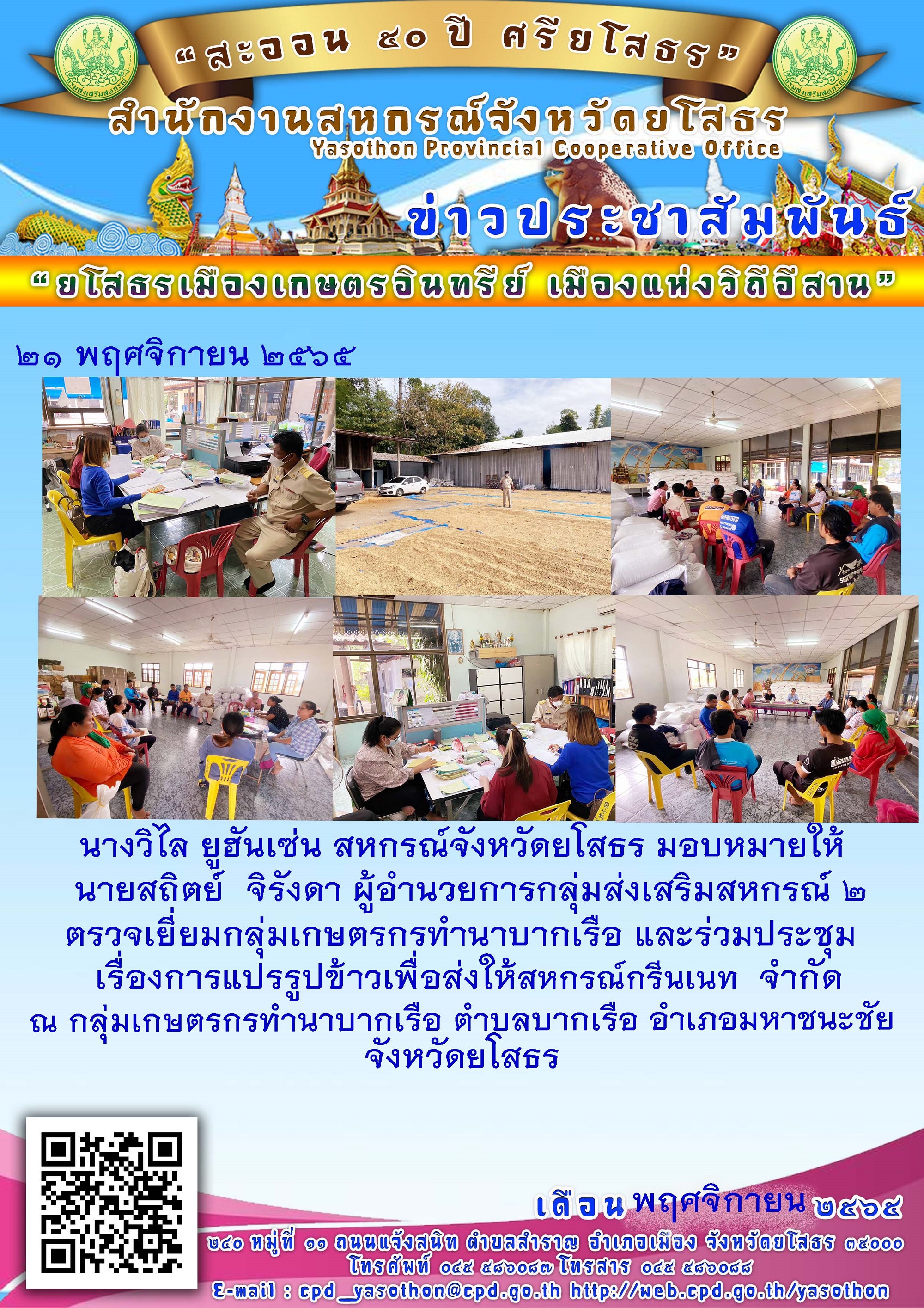 เจ้าหน้าที่สำนักงานสหกรณ์จังหวัดยโสธร ตรวจเยี่ยมกลุ่มเกษตรกรทำนาบากเรือและร่วมประชุมเรื่องการแปรรูปข้าวเพื่อส่งให้สหกรณ์กรีนเนท จำกัด