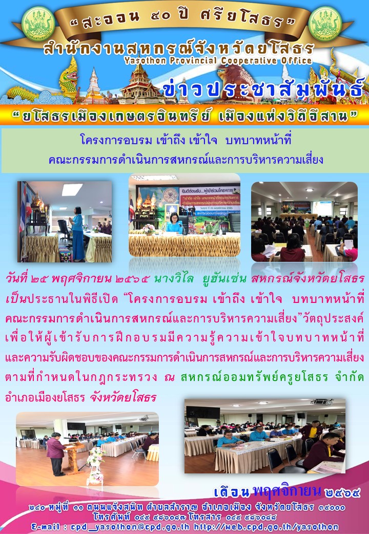 นางวิไล ยูฮันเซ่น สหกรณ์จังหวัดยโสธร เป็นประธานในพิธีเปิด"โครงการอบรม เข้าถึง เข้าใจ บทบาทหน้าที่คณะกรรมการดำเนินการสหกรณ์และการบริหารความเสี่ยง" ณ สหกรณ์ออมทรัพย์ครูยโสธร จำกัด