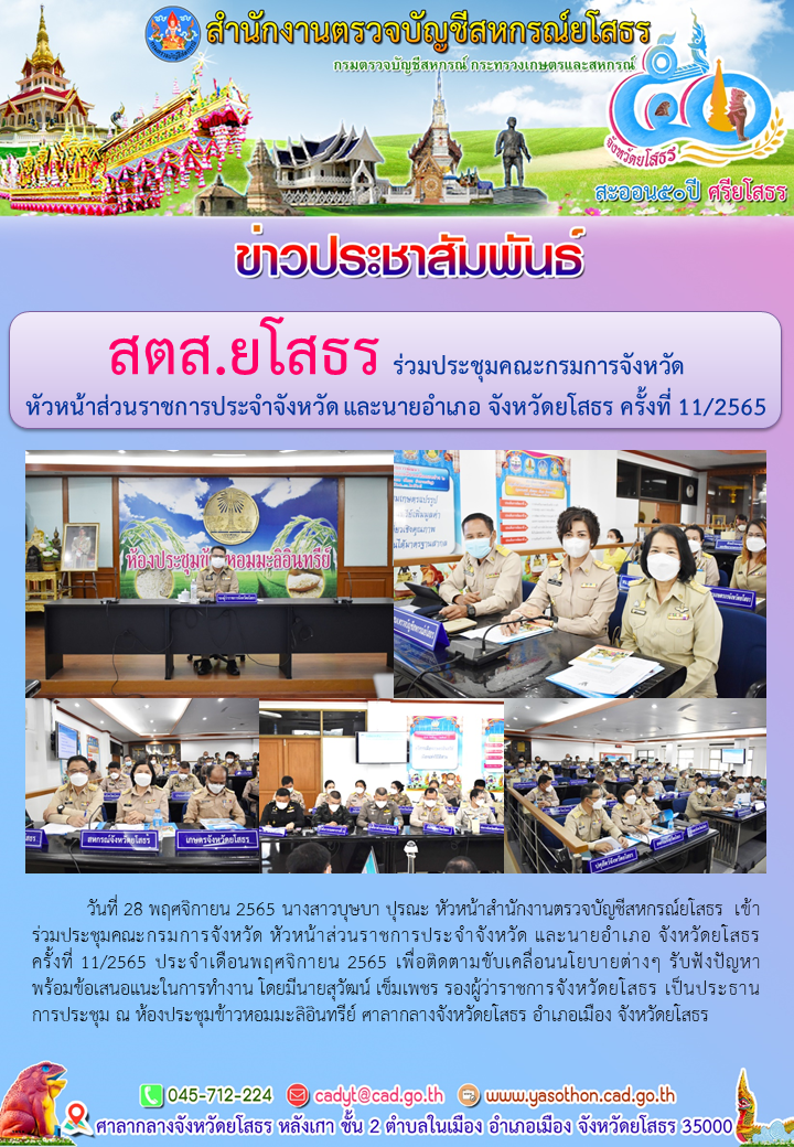 สตส.ยโสธร ร่วมประชุมคณะกรมการจังหวัด หัวหน้าส่วนราชการประจำจังหวัด และนายอำเภอ จังหวัดยโสธร ครั้งที่ 11/2565