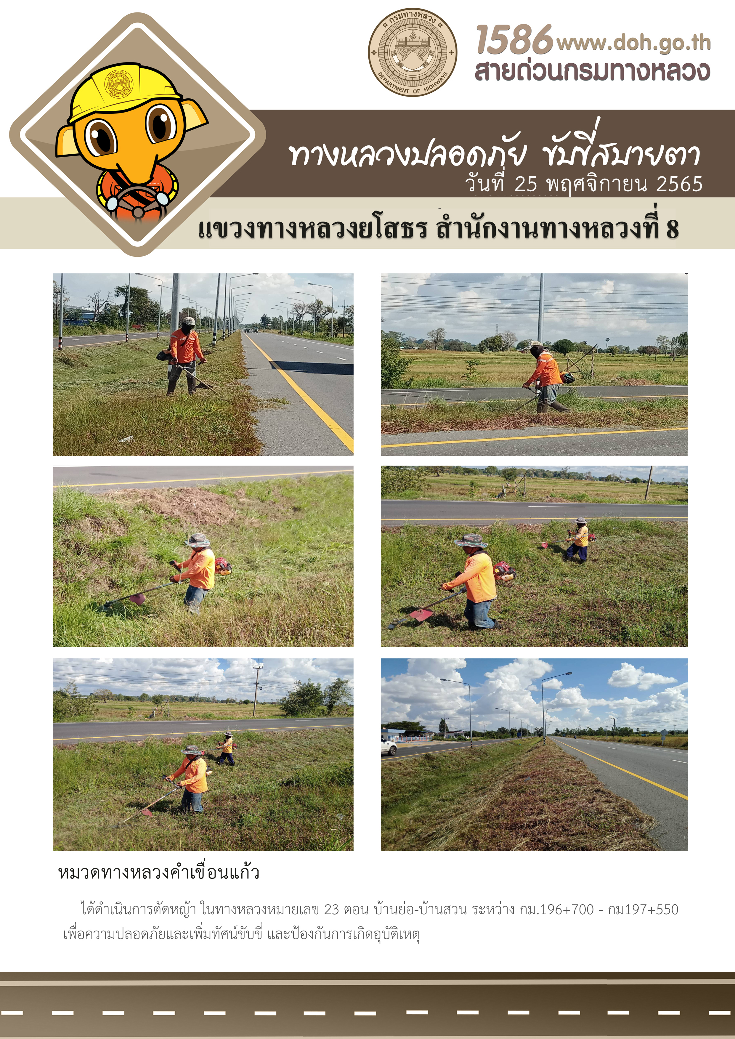 วันที่ 28 พฤศจิกายน 2565 หมวดทางหลวงคำเขื่อนแก้ว ได้ดำเนินการตัดหญ้า ในทางหลวงหมายเลข 23 ตอน บ้านย่อ-บ้านสวน ระหว่าง กม.196+700 - กม.197+550 เพื่อความปลอดภัยและเพิ่มทัศนวิสัยในการขับขี่ และป้องกันการเกิดอุบัติเหตุ