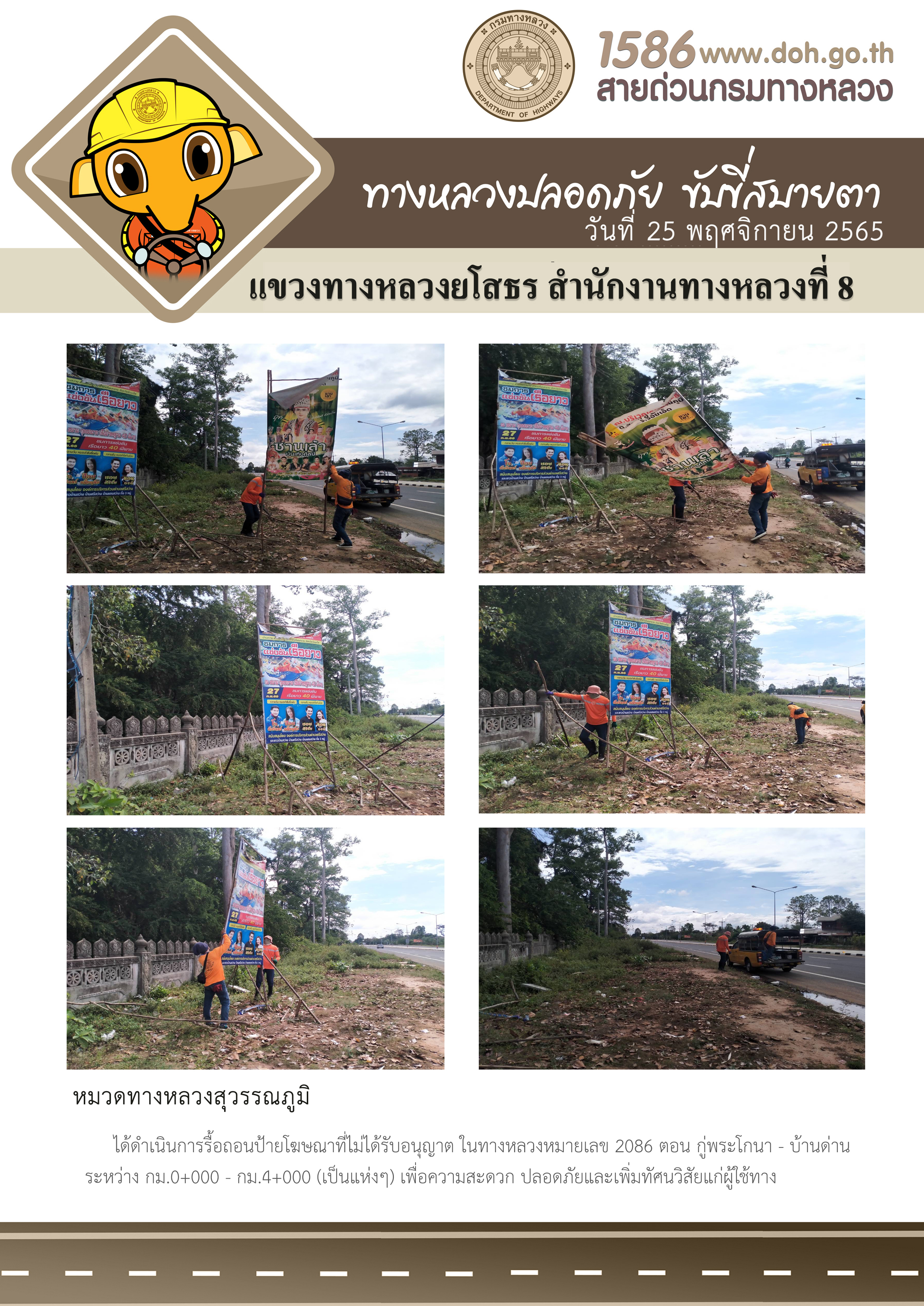 วันที่ 28 พฤศจิกายน 2565 หมวดทางหลวงสุวรรณภูมิ ได้ดำเนินการรื้อถอนป้ายโฆษณาที่ไม่ได้รับอนุญาต ในทางหลวงหมายเลข 2086 ตอน กู่พระโกนา - บ้านด่าน ระหว่าง กม.0+000 - กม.4+000 (เป็นแห่งๆ) เพื่อความสะดวก ปลอดภัยและเพิ่มทัศนวิสัยแก่ผู้ใช้ทาง