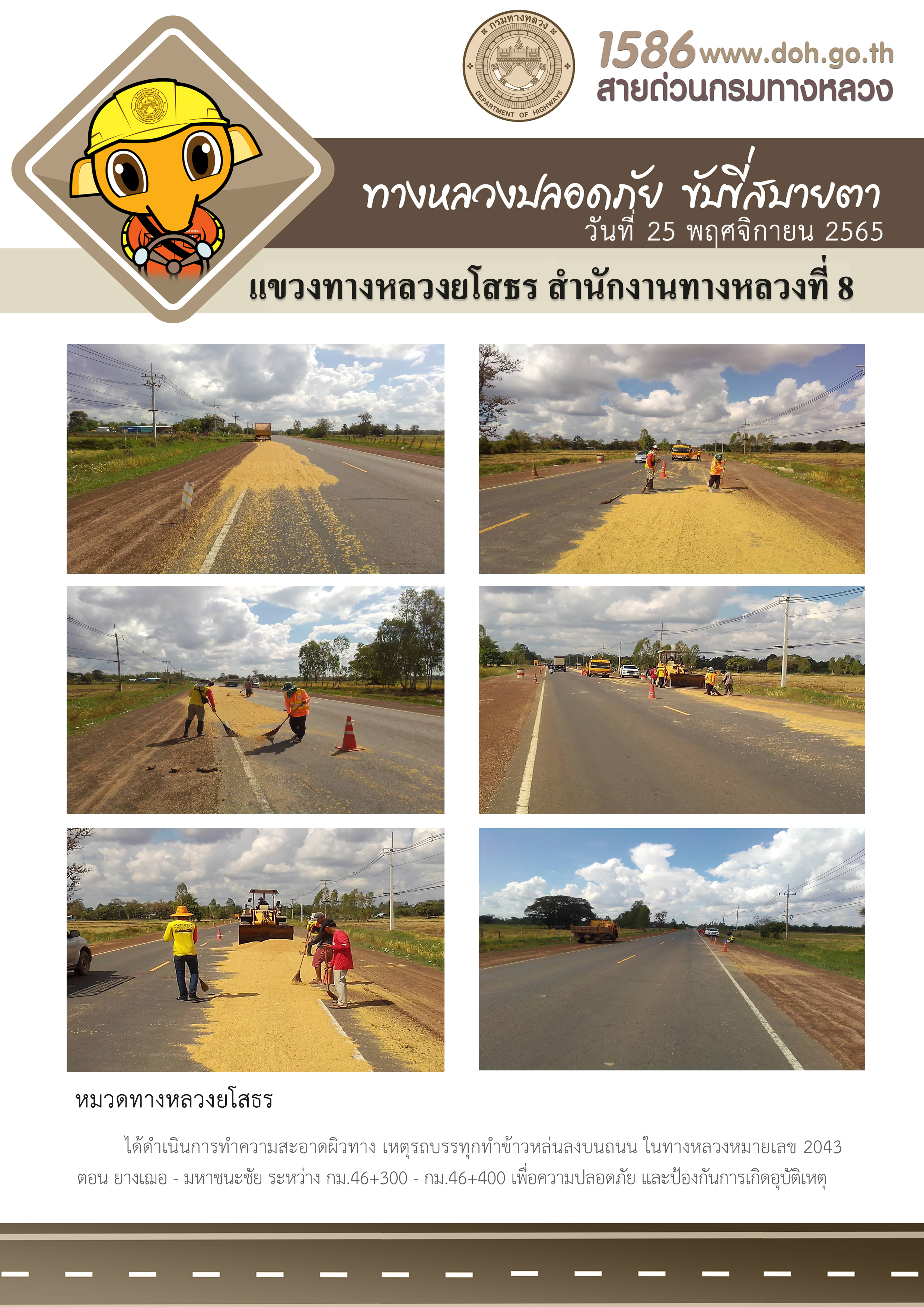 วันที่ 28 พฤศจิกายน 2565 หมวดทางหลวงยโสธร ได้ดำเนินการทำความสะอาดผิวทาง เหตุรถบรรทุกทำข้าวหล่นลงบนถนน ในทางหลวงหมายเลข 2043 ตอน ยางเฌอ - มหาชนะชัย ระหว่าง กม.46+300 - กม.46+400 เพื่อความปลอดภัย และป้องกันการเกิดอุบัติเหตุ