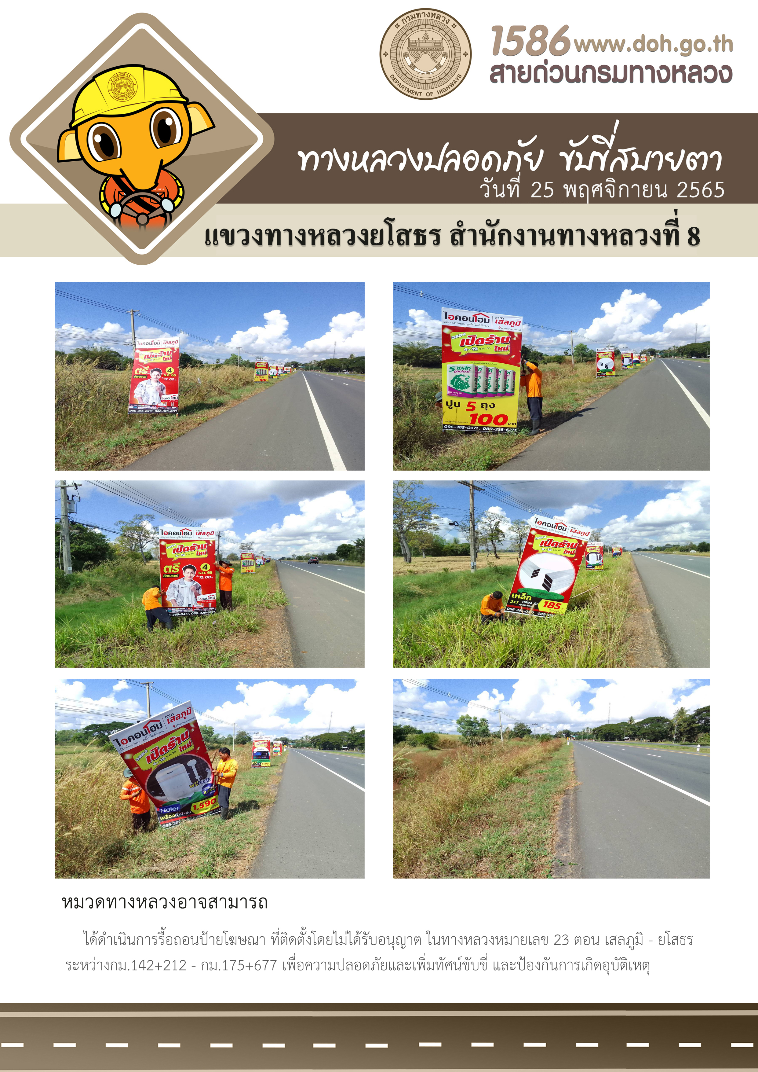 วันที่ 28 พฤศจิกายน 2565 หมวดทางหลวงอาจสามารถ ได้ดำเนินการรื้อถอนป้ายโฆษณา ที่ติดตั้งโดยไม่ได้รับอนุญาต ในทางหลวงหมายเลข 23 ตอน เสลภูมิ - ยโสธร ระหว่างกม.142+212 - กม.175+677 เพื่อความปลอดภัยและเพิ่มทัศนวิสัยในการขับขี่ และป้องกันการเกิดอุบัติเหตุ