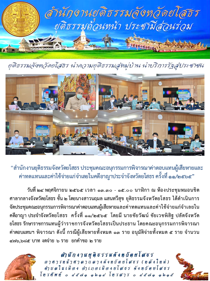 สำนักงานยุติธรรมจังหวัดยโสธร ประชุมคณะอนุกรรมการพิจารณาค่าตอบแทนผู้เสียหายและค่าทดแทนและค่าใช้จ่ายแก่จำเลยในคดีอาญาประจำจังหวัดยโสธร ครั้งที่ ๑๑/๒๕๖๕