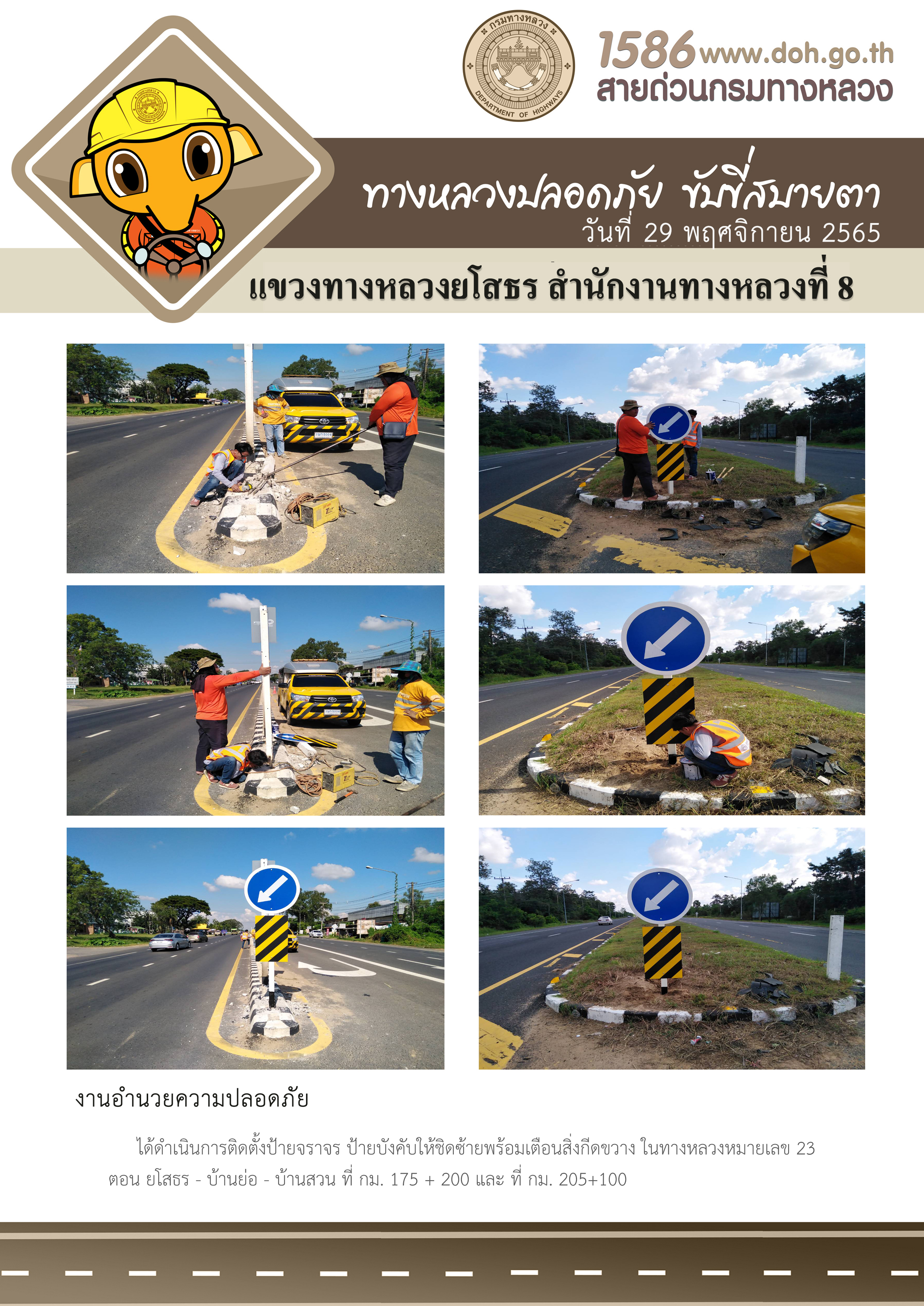 วันที่ 29 พฤศจิกายน 2565 งานอำนวยความปลอดภัย ได้ดำเนินการติดตั้งป้ายจราจร ป้ายบังคับให้ชิดซ้ายพร้อมเตือนสิ่งกีดขวาง ในทางหลวงหมายเลข 23 ตอน ยโสธร - บ้านย่อ - บ้านสวน ที่ กม. 175 + 200 และ ที่ กม. 205+100