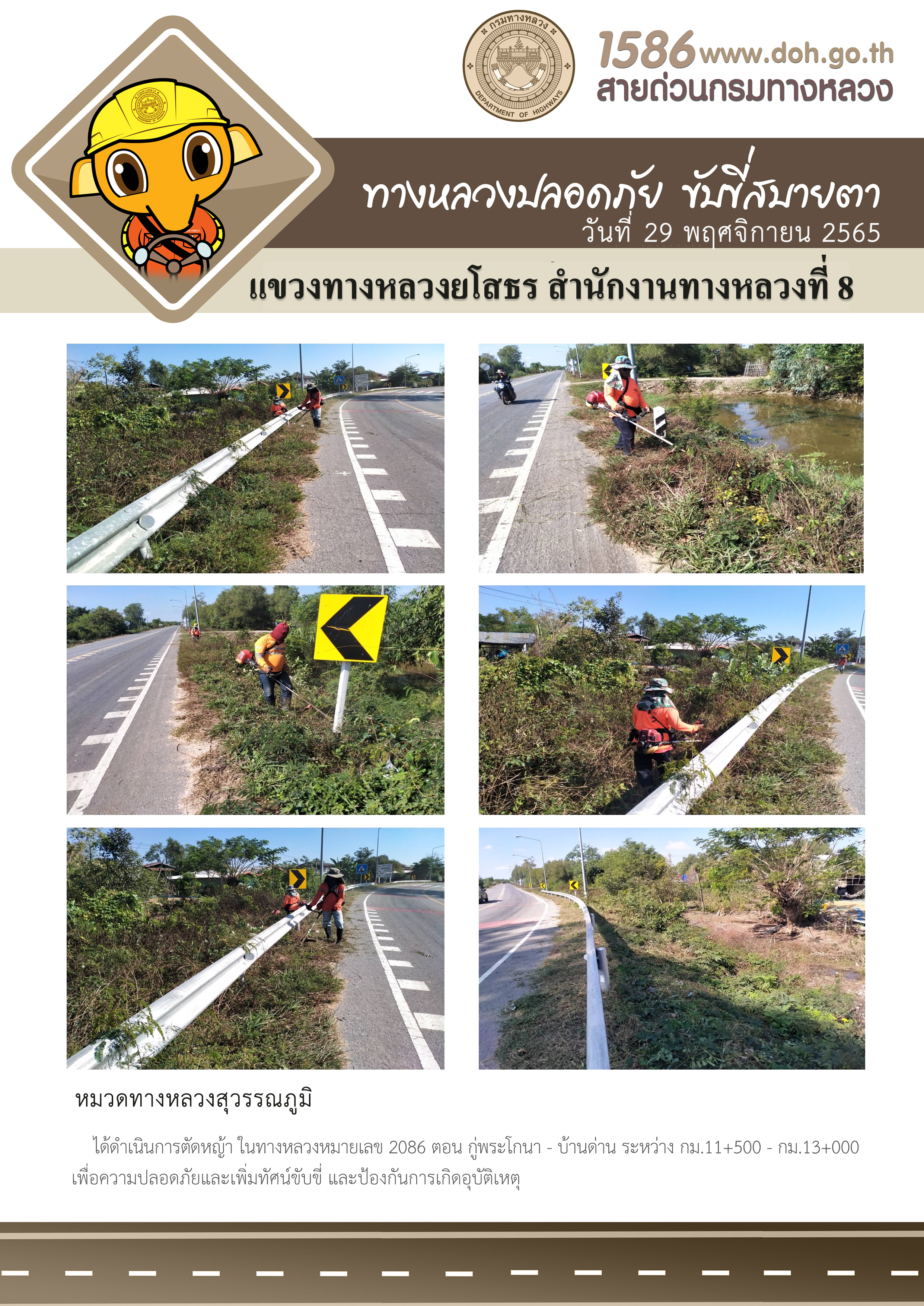 วันที่ 29 พฤศจิกายน 2565 หมวดทางหลวงสุวรรณภูมิ ได้ดำเนินการตัดหญ้า ในทางหลวงหมายเลข 2086 ตอน กู่พระโกนา - บ้านด่าน ระหว่าง กม.11+500 - กม.13+000 เพื่อความปลอดภัยและเพิ่มทัศนวิสัยในการขับขี่ และป้องกันการเกิดอุบัติเหตุ