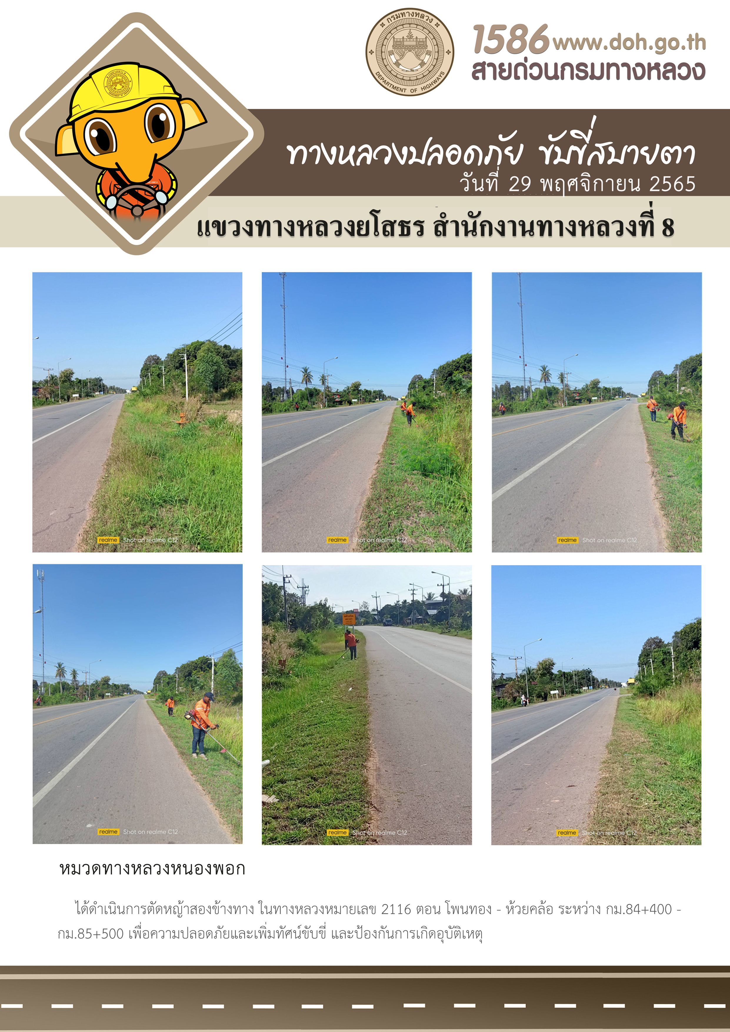 วันที่ 29 พฤศจิกายน 2565 หมวดทางหลวงหนองพอก ได้ดำเนินการตัดหญ้าสองข้างทาง ในทางหลวงหมายเลข 2116 ตอน โพนทอง - ห้วยคล้อ ระหว่าง กม.84+400 - กม.85+500 เพื่อความปลอดภัยและเพิ่มทัศนวิสัยในการขับขี่ และป้องกันการเกิดอุบัติเหตุ