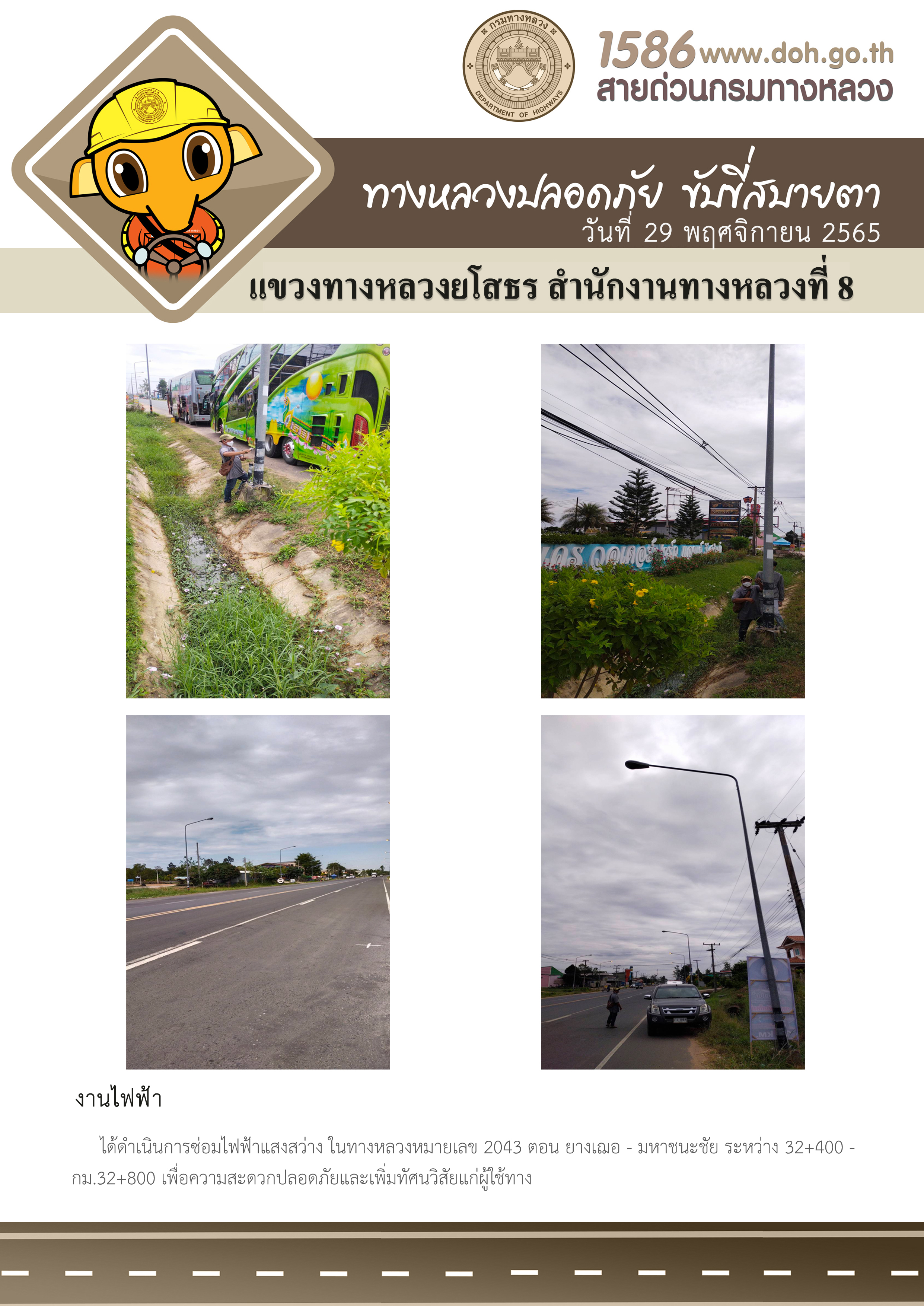 วันที่ 29 พฤศจิกายน 2565 งานไฟฟ้า ได้ดำเนินการซ่อมไฟฟ้าแสงสว่าง ในทางหลวงหมายเลข 2043 ตอน ยางเฌอ - มหาชนะชัย ระหว่าง กม. 32+400 - กม.32+800 เพื่อความสะดวกปลอดภัยและเพิ่มทัศนวิสัยแก่ผู้ใช้ทาง