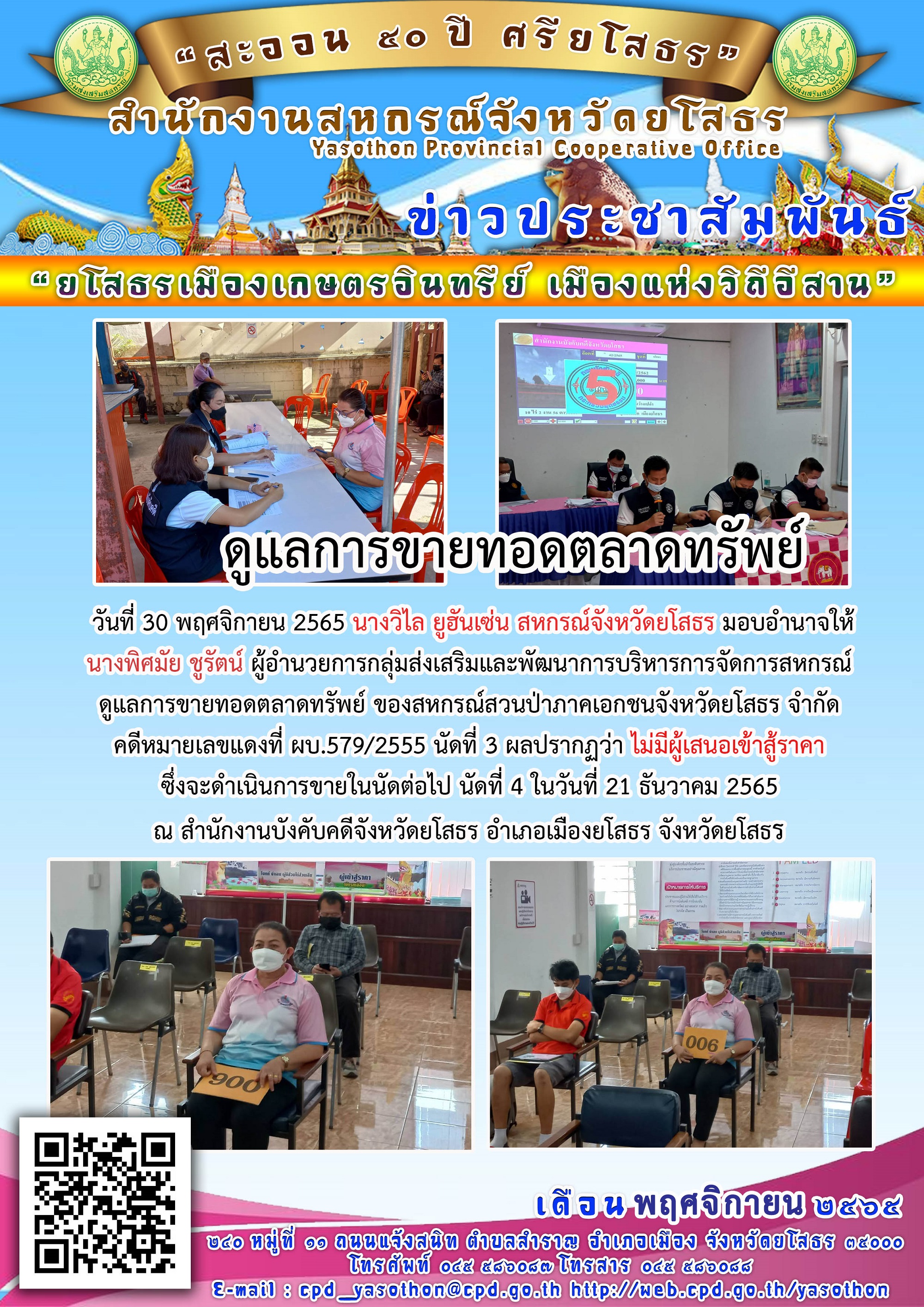 เจ้าหน้าที่สำนักงานสหกรณ์จังหวัดดูแลการขายทอดตลาดทรัพย์ ของสหกรณ์สวนป่าภาคเอกชนจังหวัดยโสธร จำกัด คดีหมายเลขแดงที่ ผบ.579/2555 ณ สำนักงานบังคับคดีจังหวัดยโสธร อำเภอเมืองยโสธร จังหวัดยโสธร