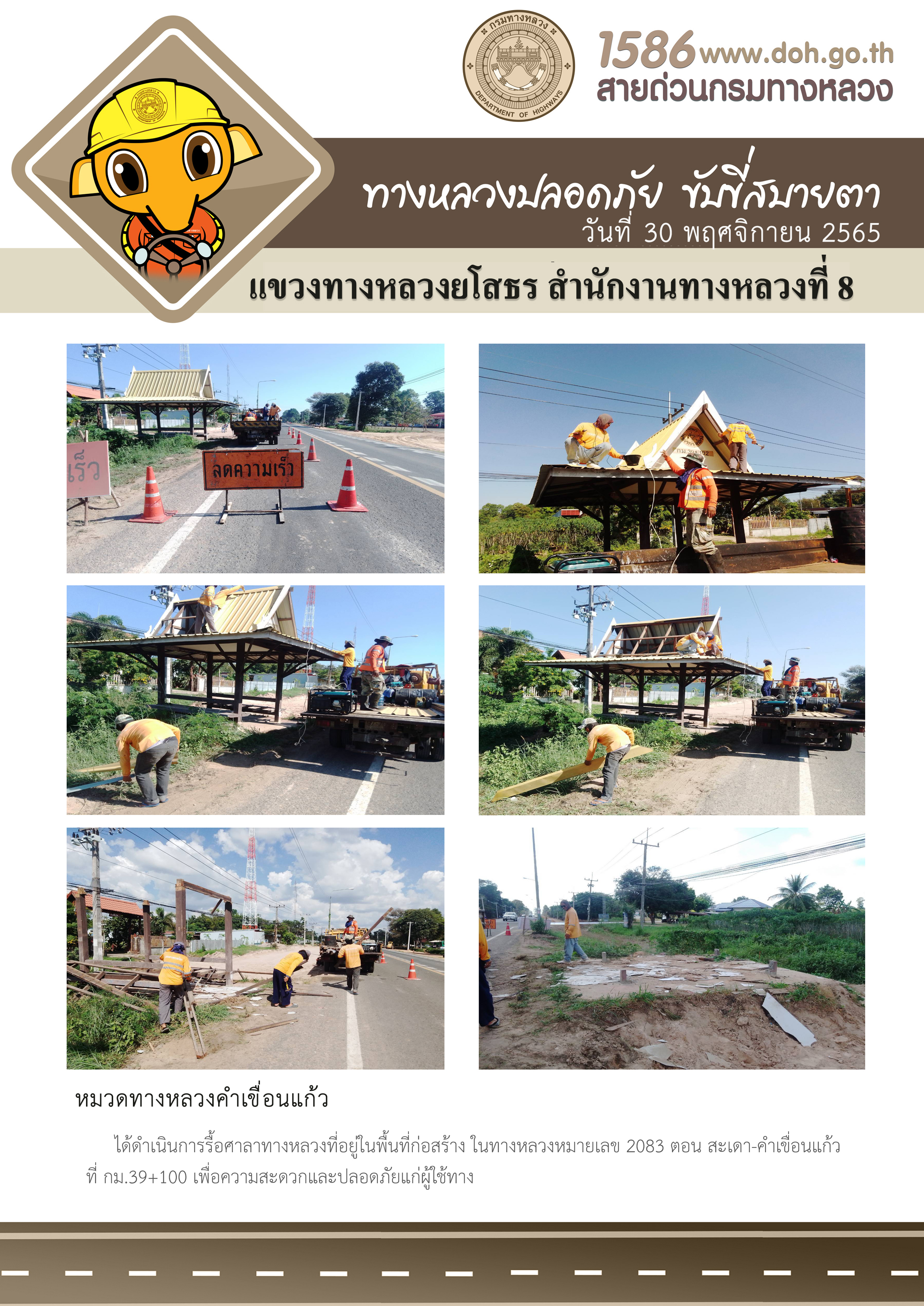 วันที่ 30 พฤศจิกายน 2565 หมวดทางหลวงคำเขื่อนแก้ว ได้ดำเนินการรื้อศาลาทางหลวงที่อยู่ในพื้นที่ก่อสร้าง ในทางหลวงหมายเลข 2083 ตอน สะเดา-คำเขื่อนแก้ว ที่ กม.39+100 เพื่อความสะดวกและปลอดภัยแก่ผู้ใช้ทาง