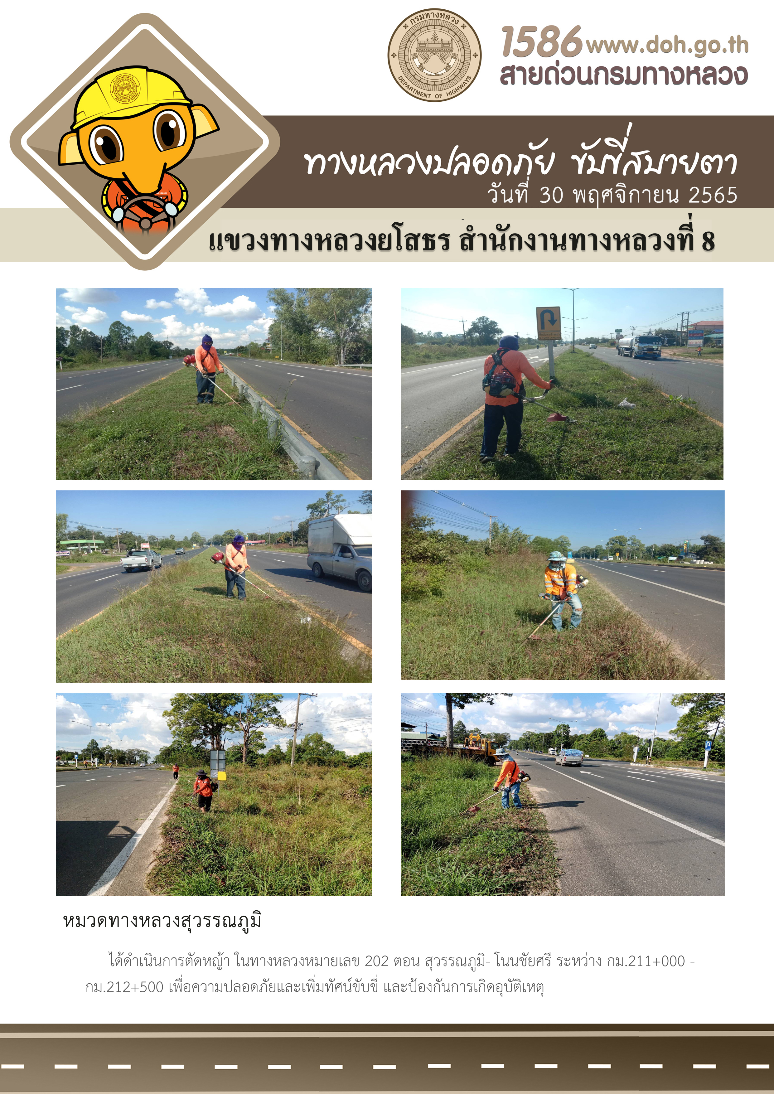 วันที่ 30 พฤศจิกายน 2565 หมวดทางหลวงสุวรรณภูมิ ได้ดำเนินการตัดหญ้า ในทางหลวงหมายเลข 202 ตอน สุวรรณภูมิ- โนนชัยศรี ระหว่าง กม.211+000 - กม.212+500 เพื่อความปลอดภัยและเพิ่มทัศนวิสัยในการขับขี่ และป้องกันการเกิดอุบัติเหตุ