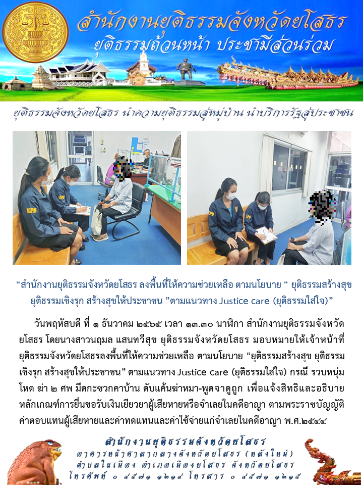 วันที่ 1 ธ.ค. 2565 (16:19 น.)วันพฤหัสบดี ที่ 1 ธันวาคม 2565 เวลา 13.30 นาฬิกา สำนักงานยุติธรรมจังหวัดยโสธร โดยนางสาวนฤมล แสนทวีสุข ยุติธรรมจังหวัดยโสธร มอบหมายให้เจ้าหน้าที่ยุติธรรมจังหวัดยโสธรลงพื้นที่ให้ความช่วยเหลือ ตามนโยบาย “ยุติธรรมสร้างสุข ยุติธรรมเชิงรุก สร้างสุขให้ประชาชน” ตามแนวทาง Justice care (ยุติธรรมใส่ใจ) กรณี รวบหนุ่มโหด ฆ่า 2 ศพ มีดกะซวกคาบ้าน ดับแค้นฆ่าหมา-พูดจาดูถูก เพื่อแจ้งสิทธิและอธิบายหลักเกณฑ์การยื่นขอรับเงินเยียวยาผู้เสียหายหรือจำเลยในคดีอาญา ตามพระราชบัญญัติค่าตอบแทนผู้เสียหายและค่าทดแทนและค่าใช้จ่ายแก่จำเลยในคดีอาญา พ.ศ.2544