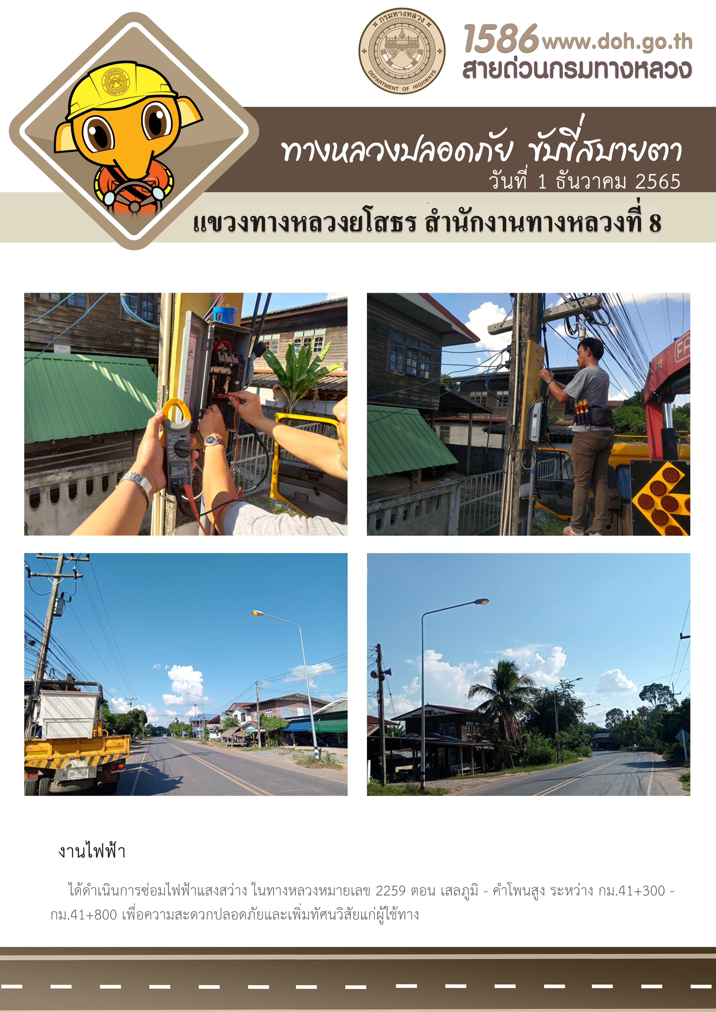 วันที่ 1 ธันวาคม 2565 งานไฟฟ้า ได้ดำเนินการซ่อมไฟฟ้าแสงสว่าง ในทางหลวงหมายเลข 2259 ตอน เสลภูมิ - คำโพนสูง ระหว่าง กม.41+300 - กม.41+800 เพื่อความสะดวกปลอดภัยและเพิ่มทัศนวิสัยแก่ผู้ใช้ทาง