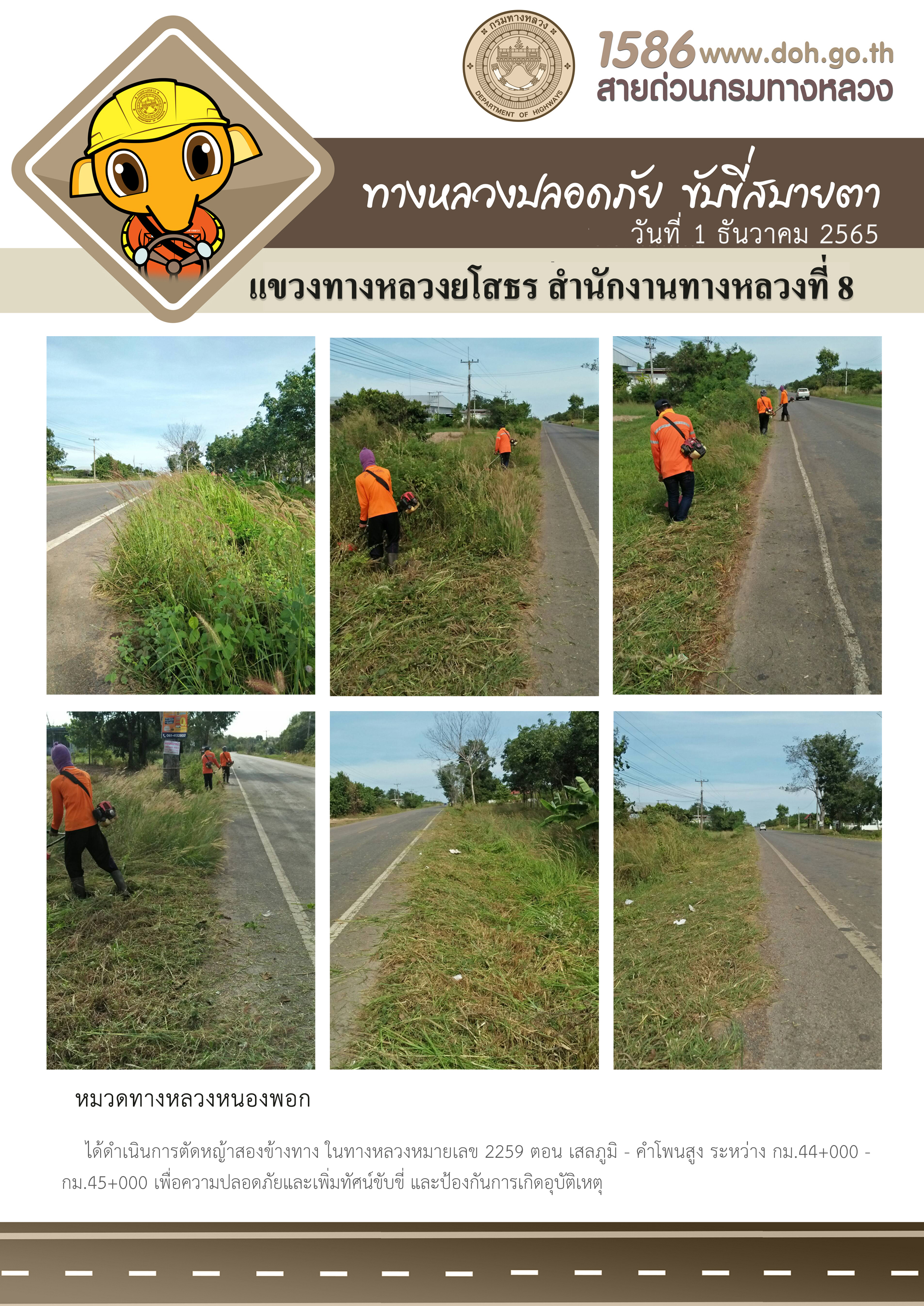 วันที่ 1 ธันวาคม 2565 หมวดทางหลวงหนองพอก ได้ดำเนินการตัดหญ้าสองข้างทาง ในทางหลวงหมายเลข 2259 ตอน เสลภูมิ - คำโพนสูง ระหว่าง กม.44+000 - กม.45+000 เพื่อความปลอดภัยและเพิ่มทัศนวิสัยในการขับขี่ และป้องกันการเกิดอุบัติเหตุ