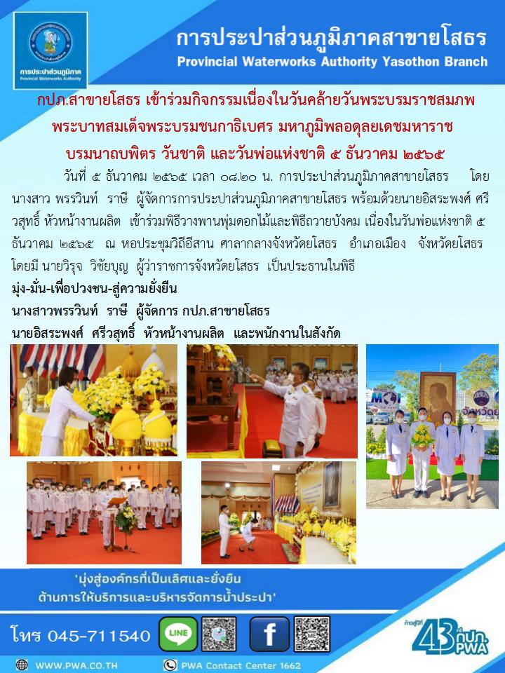 กปภ.สาขายโสธร เข้าร่วมกิจกรรมเนื่องในวันคล้ายวันพระบรมราชสมภพ พระบาทสมเด็จพระบรมชนกาธิเบศร มหาภูมิพลอดุลยเดชมหาราช บรมนาถบพิตร วันชาติ และวันพ่อแห่งชาติ 5 ธันวาคม 2565