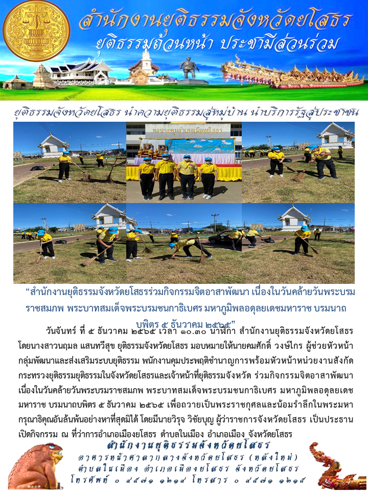 สำนักงานยุติธรรมจังหวัดยโสธรร่วมกิจกรรมจิตอาสาพัฒนา เนื่องในวันคล้ายวันพระบรมราชสมภพ พระบาทสมเด็จพระบรมชนกาธิเบศร มหาภูมิพลอดุลยเดชมหาราช บรมนาถบพิตร 5 ธันวาคม 2565