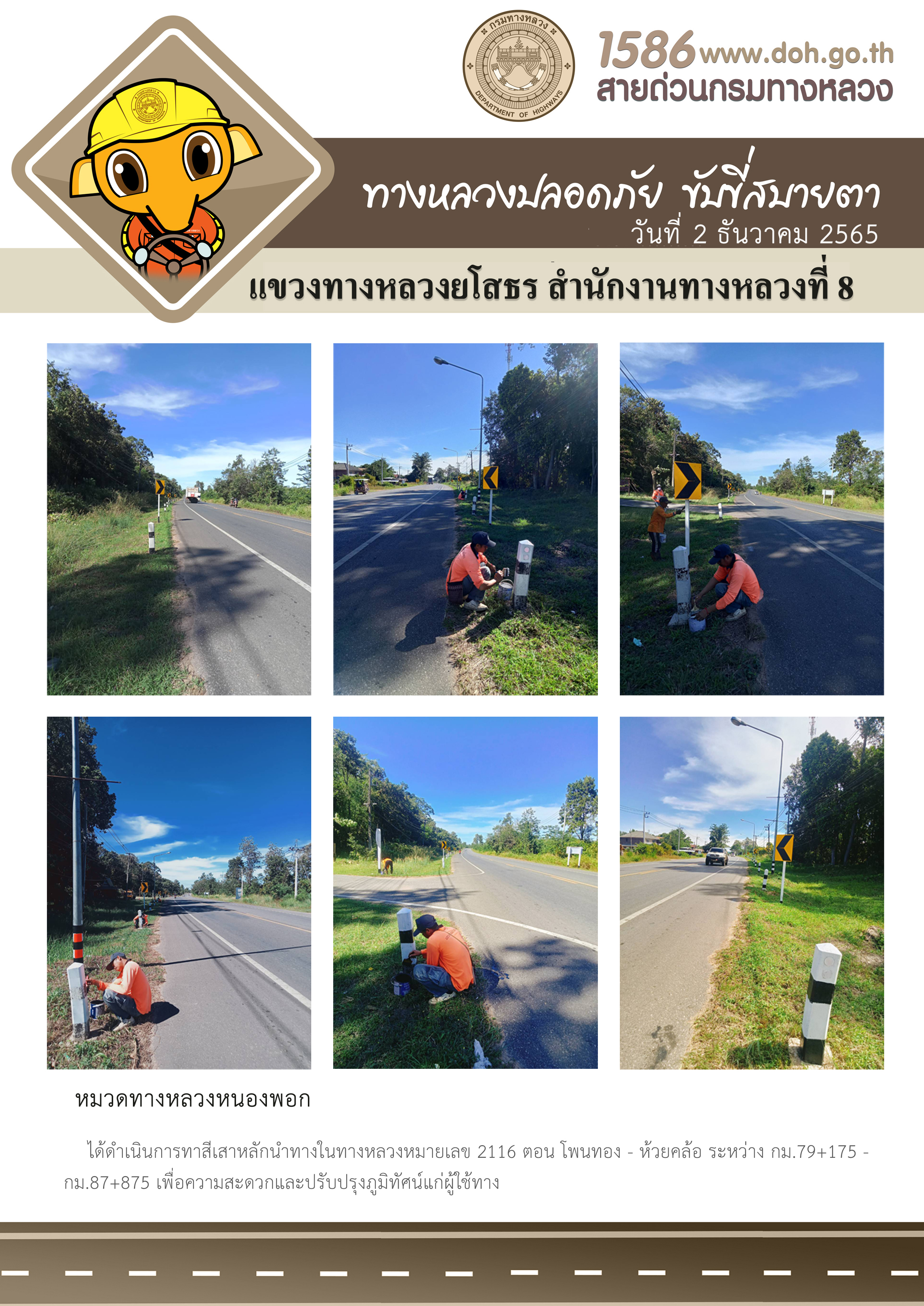 วันที่ 2 ธันวาคม 2565 หมวดทางหลวงหนองพอก ได้ดำเนินการเทสีเสาหลักนำทางในทางหลวงหมายเลข 2116 ตอน โพนทอง - ห้วยคล้อ ระหว่าง กม.79+175 - กม.87+875 เพื่อความสะดวกและปรับปรุงภูมิทัศน์แก่ผู้ใช้ทาง
