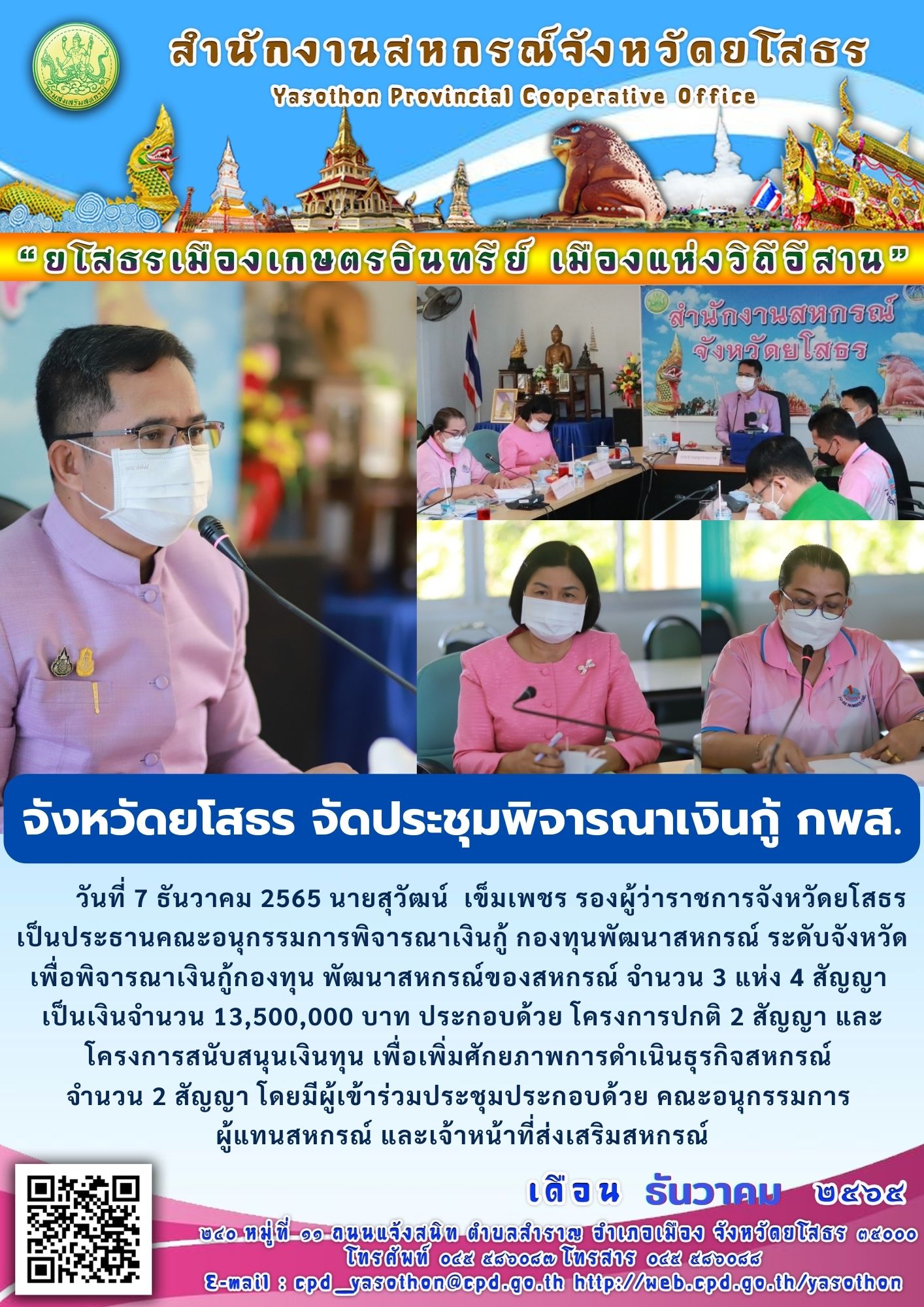 นายสุวัฒน์ เข็มเพชร รองผู้ว่าราชการจังหวัดยโสธร เป็นประธานคณะอนุกรรมการพิจารณาเงินกู้กองทุนพัฒนาสหกรณ์ ระดับจังหวัด ณ ห้องประชุมสำนักงานสหกรณ์จังหวัดยโสธร