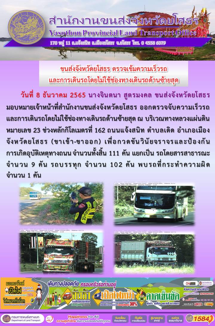 วันที่ 8 ธันวาคม 2565 เจ้าหน้าที่สำนักงานขนส่งจังหวัดยโสธร ออกตั้งจุดตรวจจับความเร็ว