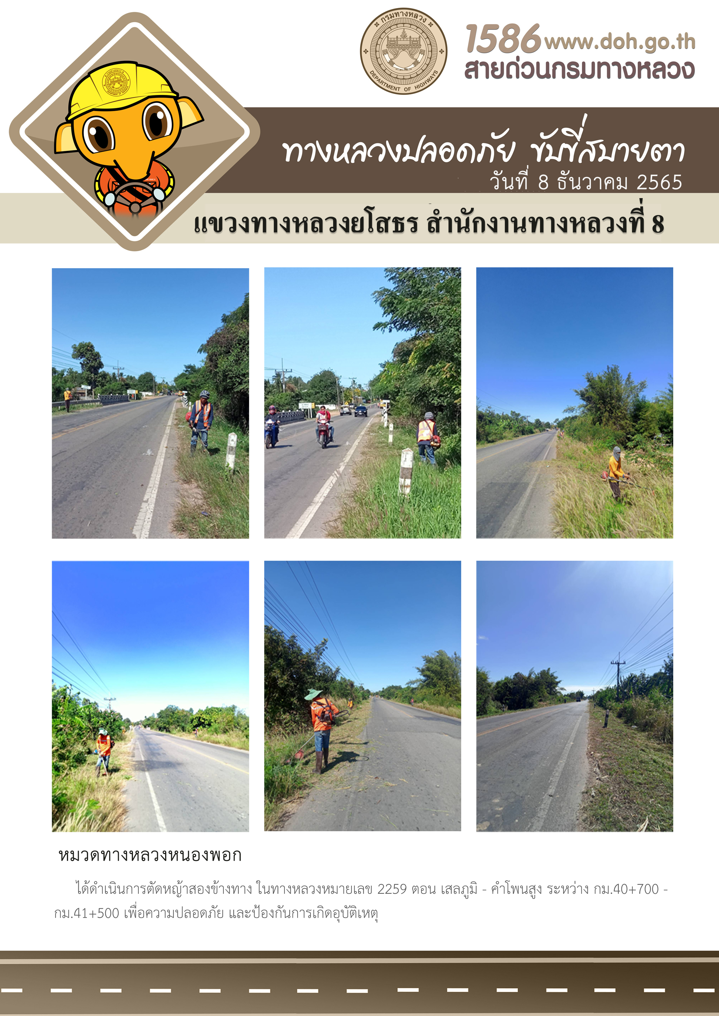 วันที่ 8 ธันวาคม 2565 หมวดทางหลวงหนองพอก ได้ดำเนินการตัดหญ้าสองข้างทาง ในทางหลวงหมายเลข 2259 ตอน เสลภูมิ - คำโพนสูง ระหว่าง กม.40+700 - กม.41+500 เพื่อความปลอดภัย และป้องกันการเกิดอุบัติเหตุ