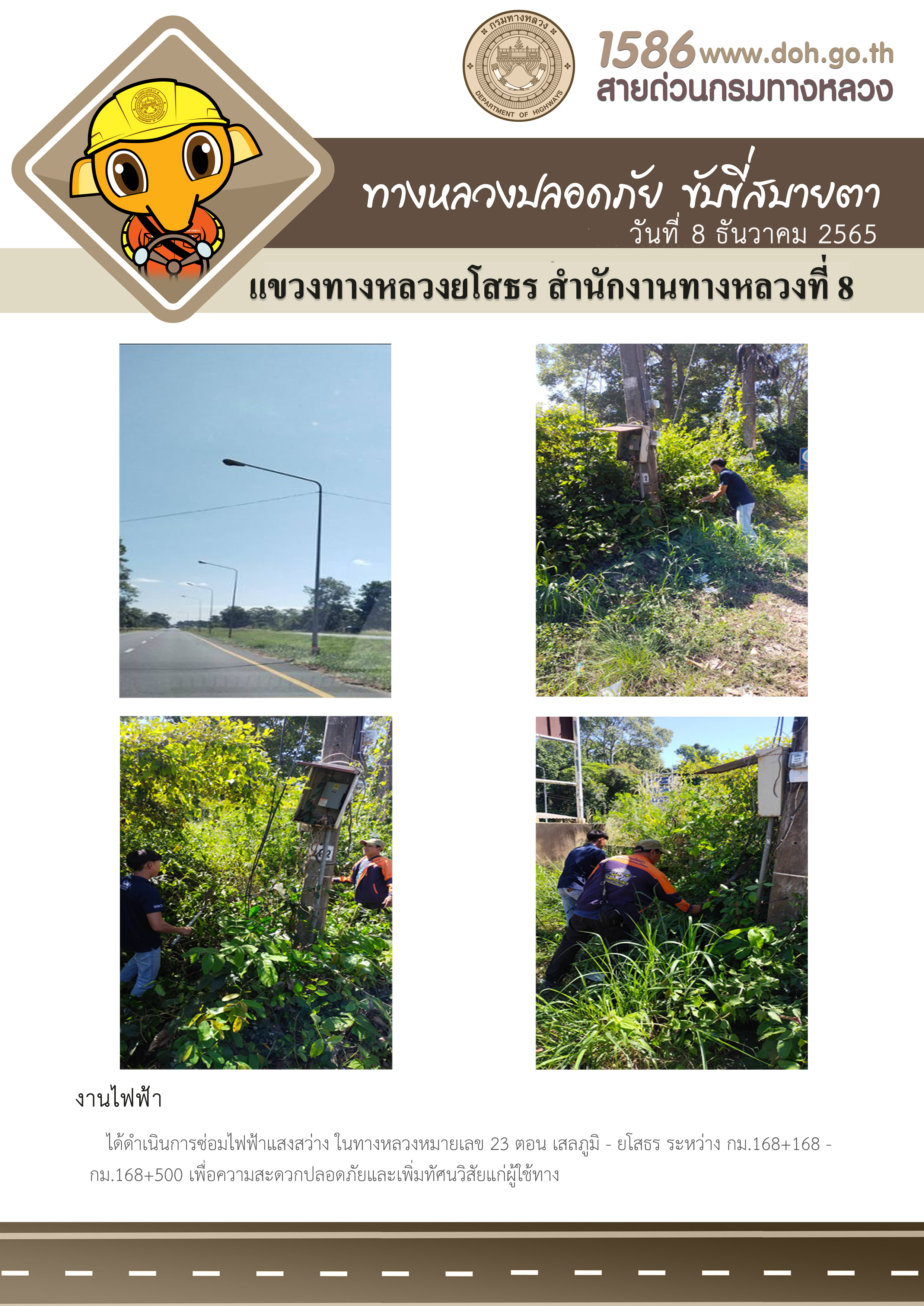 วันที่ 8 ธันวาคม 2565 งานไฟฟ้า ได้ดำเนินการซ่อมไฟฟ้าแสงสว่าง ในทางหลวงหมายเลข 23 ตอน เสลภูมิ - ยโสธร ระหว่าง กม.168+168 - กม.168+500 เพื่อความสะดวกปลอดภัยและเพิ่มทัศนวิสัยแก่ผู้ใช้ทาง