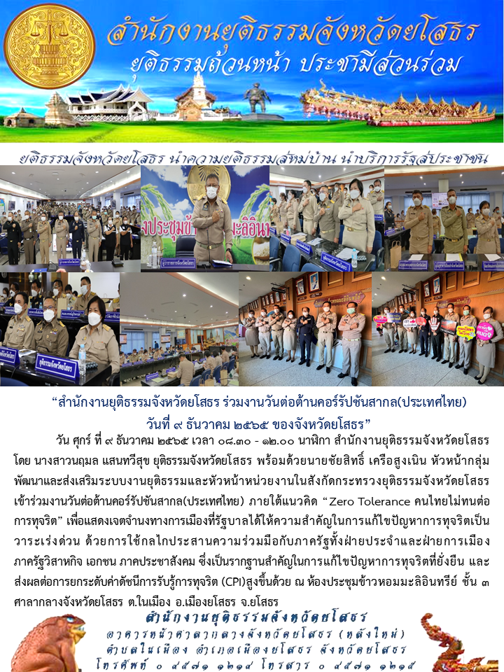 วันที่ 9 ธ.ค. 2565 (15:08 น.)วัน ศุกร์ ที่ 9 ธันวาคม 2565 เวลา 08.30 - 12.00 นาฬิกา สำนักงานยุติธรรมจังหวัดยโสธร โดย นางสาวนฤมล แสนทวีสุข ยุติธรรมจังหวัดยโสธร พร้อมด้วยนายชัยสิทธิ์ เครือสูงเนิน หัวหน้ากลุ่มพัฒนาและส่งเสริมระบบงานยุติธรรมและหัวหน้าหน่วยงานในสังกัดกระทรวงยุติธรรมจังหวัดยโสธร เข้าร่วมงานวันต่อต้านคอร์รัปชันสากล(ประเทศไทย) ภายใต้แนวคิด “Zero Tolerance คนไทยไม่ทนต่อการทุจริต” เพื่อแสดงเจตจำนงทางการเมืองที่รัฐบาลได้ให้ความสำคัญในการแก้ไขปัญหาการทุจริตเป็นวาระเร่งด่วน ด้วยการใช้กลไกประสานความร่วมมือกับภาครัฐทั้งฝ่ายประจำและฝ่ายการเมือง ภาครัฐวิสาหกิจ เอกชน ภาคประชาสังคม ซึ่งเป็นรากฐานสำคัญในการแก้ไขปัญหาการทุจริตที่ยั่งยืน และส่งผลต่อการยกระดับค่าดัชนีการรับรู้การทุจริต (CPI) สูงขึ้นด้วย ณ ห้องประชุมข้าวหอมมะลิอินทรีย์ ชั้น 3 ศาลากลางจังหวัดยโสธร ต.ในเมือง อ.เมืองยโสธร จ.ยโสธร