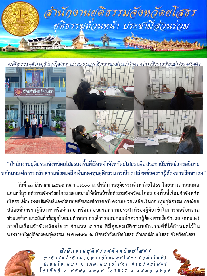 สำนักงานยุติธรรมจังหวัดยโสธรลงพื้นที่เรือนจำจังหวัดยโสธร เพื่อประชาสัมพันธ์และอธิบายหลักเกณฑ์การขอรับความช่วยเหลือเงินกองทุนยุติธรรม กรณีขอปล่อยชั่วคราวผู้ต้องหาหรือจำเลย 13 ธันวาคม 2565