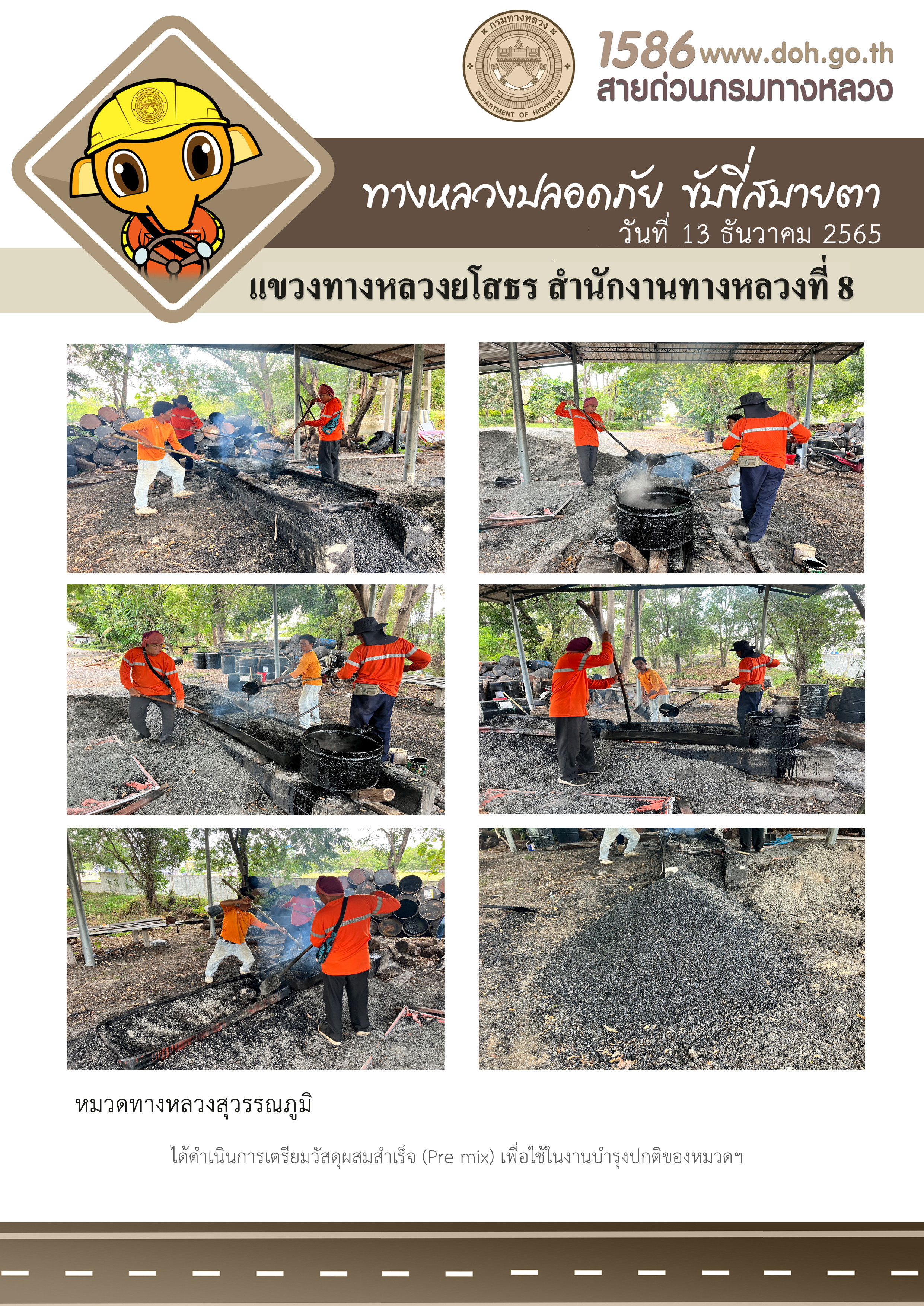 วันที่ 13 ธันวาคม 2565 หมวดทางหลวงสุวรรณภูมิ ได้ดำเนินการเตรียมวัสดุผสมสำเร็จ (Pre mix) เพื่อใช้ในงานบำรุงปกติของหมวดฯ