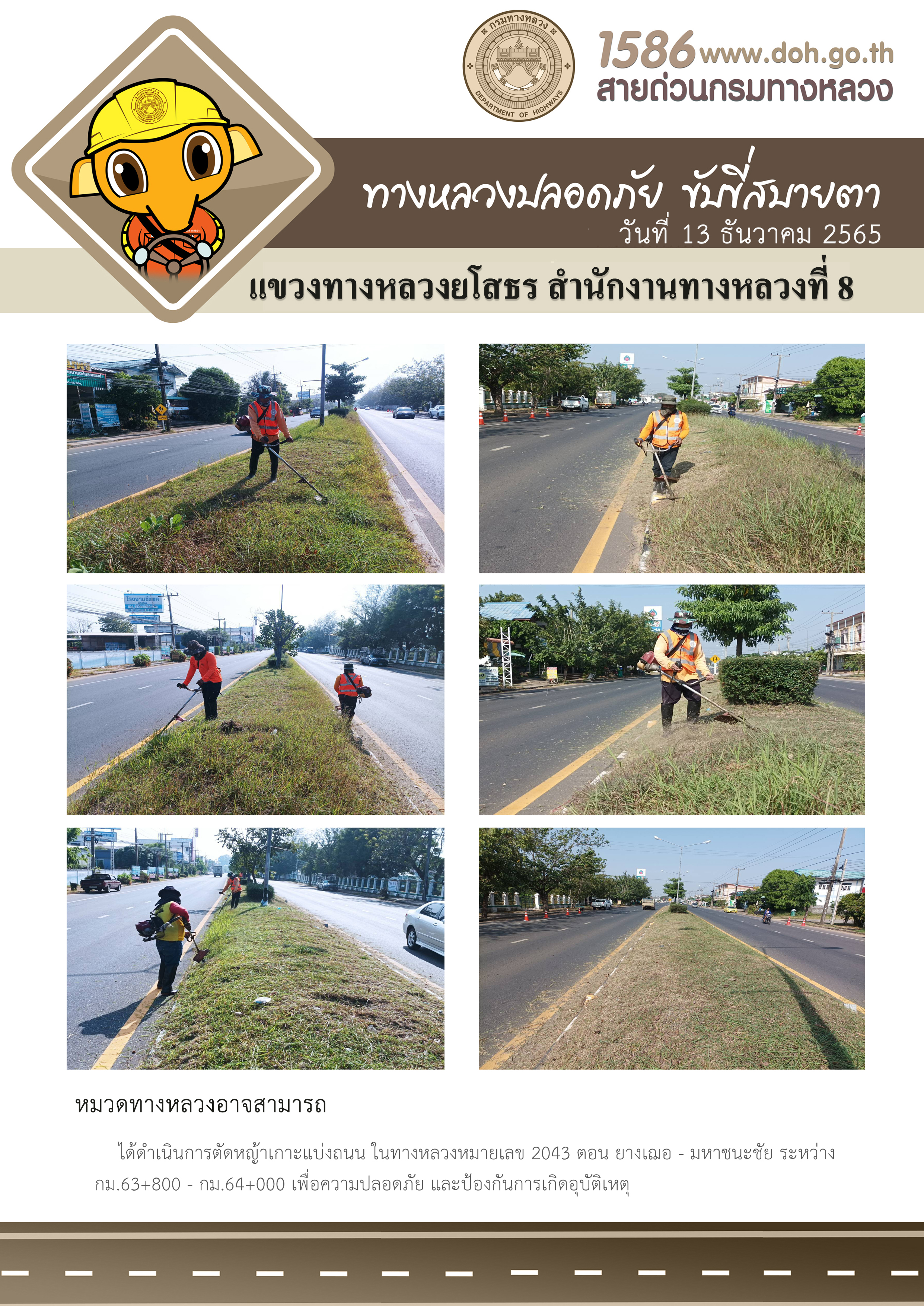 - [15:29] ทั่วไป วันจันทร์ที่ 20 เมษายน 2569 งานอำนวยความปลอดภัย ได้ดำเนินการตัดหญ้า, ทำความสะอาดในบริเวณแขวงทางหลวงยโสธร