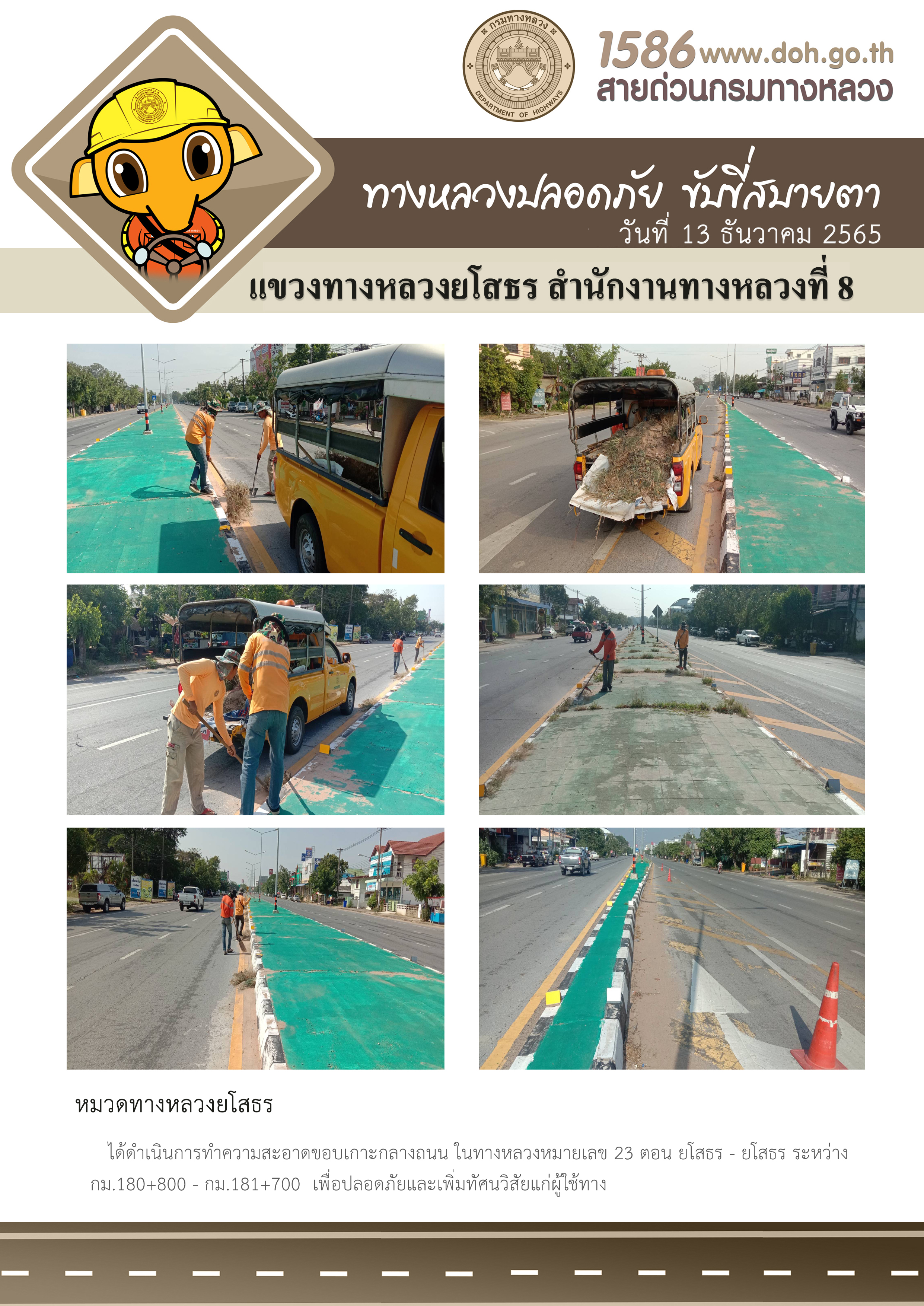 วันที่ 13 ธันวาคม 2565 หมวดทางหลวงยโสธร ได้ดำเนินการทำความสะอาดขอบเกาะกลางถนน ในทางหลวงหมายเลข 23 ตอน ยโสธร - ยโสธร ระหว่าง กม.180+800 - กม.181+700 เพื่อปลอดภัยและเพิ่มทัศนวิสัยแก่ผู้ใช้ทาง