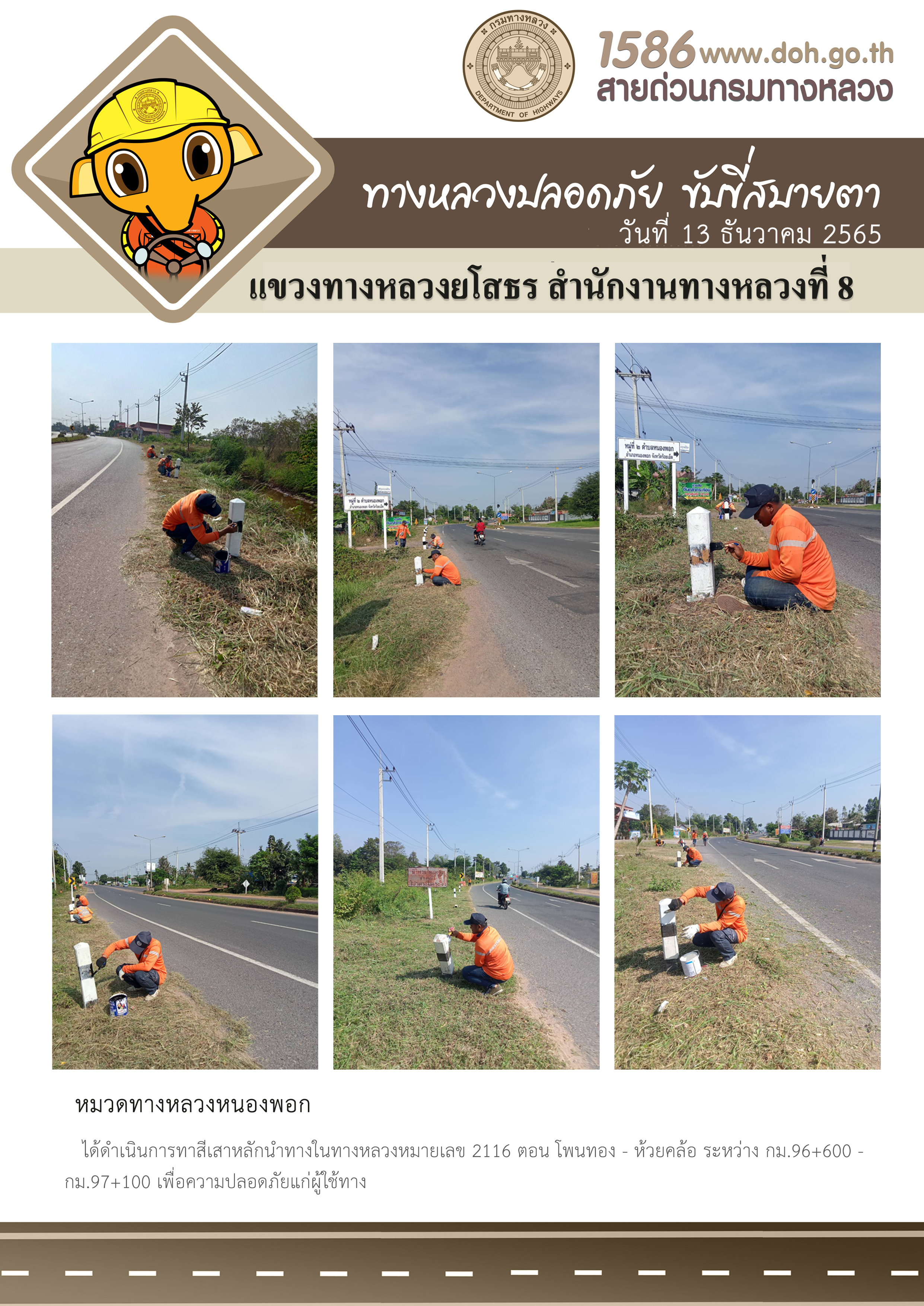 วันที่ 13 ธันวาคม 2565 หมวดทางหลวงหนองพอก ได้ดำเนินการทาสีเสาหลักนำทาง ในทางหลวงหมายเลข 2116 ตอน โพนทอง - ห้วยคล้อ ระหว่าง กม.96+600 - กม.97+100 เพื่อความปลอดภัยแก่ผู้ใช้ทาง