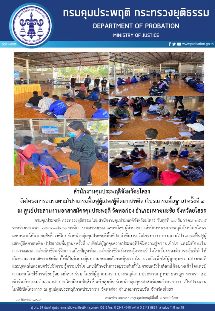 สำนักงานคุมประพฤติจังหวัดยโสธร จัดโครงการอบรมตามโปรแกรมฟื้นฟูผู้เสพ/ผู้ติดยาเสพติด (โปรแกรมพื้นฐาน) ครั้งที่ 4 ณ ศูนย์ประสานงานอาสาสมัครคุมประพฤติ วัดหอก่อง อำเภอมหาชนะชัย จังหวัดยโสธร