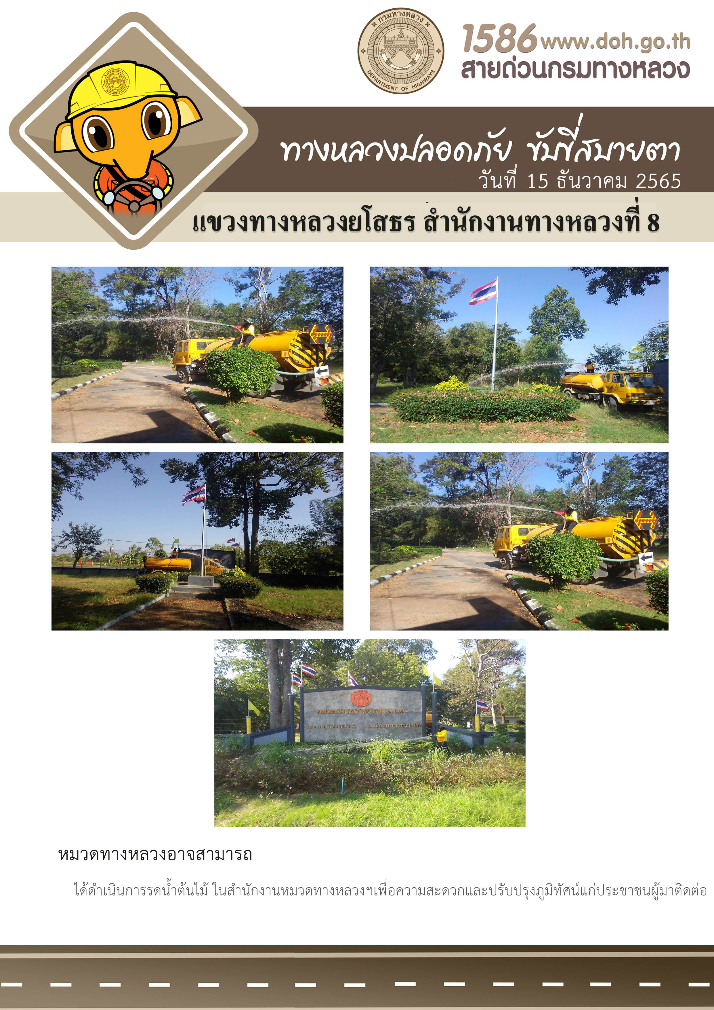 - [15:29] ทั่วไป วันจันทร์ที่ 20 เมษายน 2569 งานอำนวยความปลอดภัย ได้ดำเนินการตัดหญ้า, ทำความสะอาดในบริเวณแขวงทางหลวงยโสธร