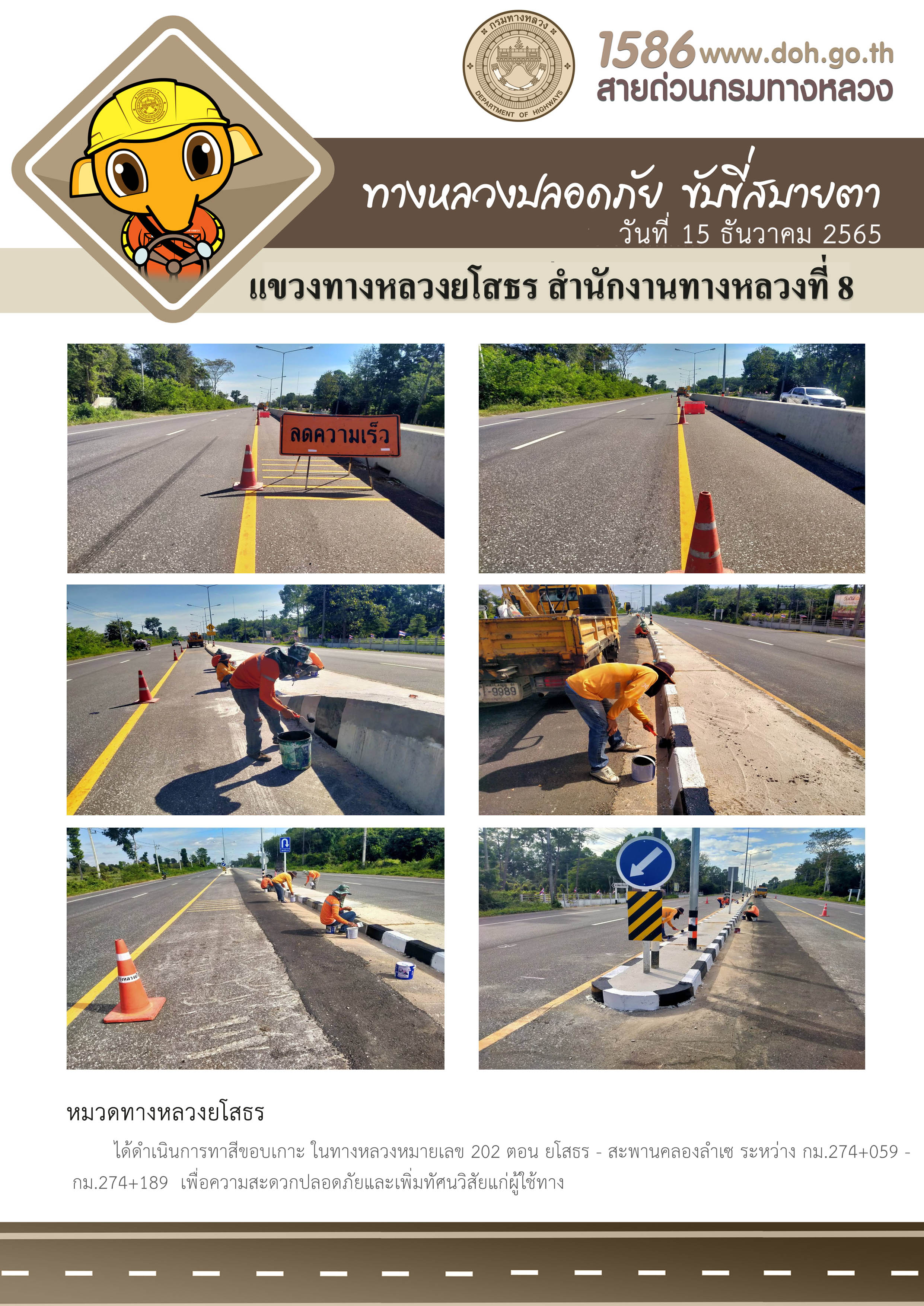 วันที่ 15 ธันวาคม 2565 หมวดทางหลวงยโสธร ได้ดำเนินการทาสีขอบเกาะ ในทางหลวงหมายเลข 202 ตอน ยโสธร - สะพานคลองลำเซ ระหว่าง กม.274+059 - กม.274+189 เพื่อความสะดวกปลอดภัยและเพิ่มทัศนวิสัยแก่ผู้ใช้ทาง