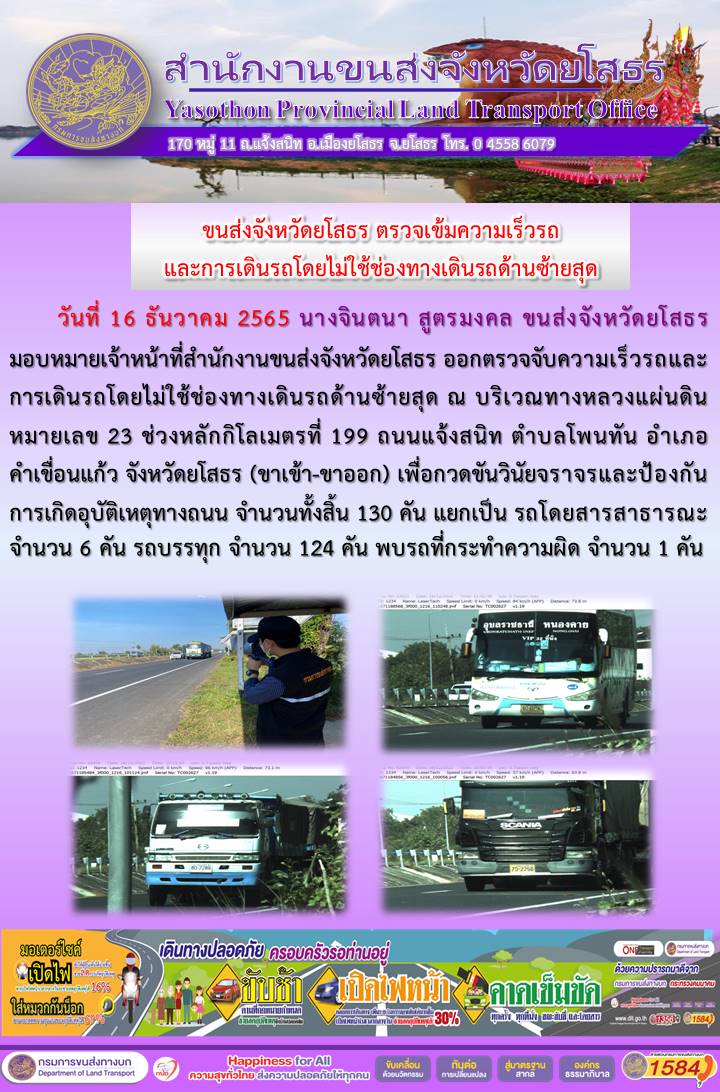 วันที่ 16 ธันวาคม 2565 เจ้าหน้าที่สำนักงานขนส่งจังหวัดยโสธร ออกตั้งจุดตรวจจับความเร็ว