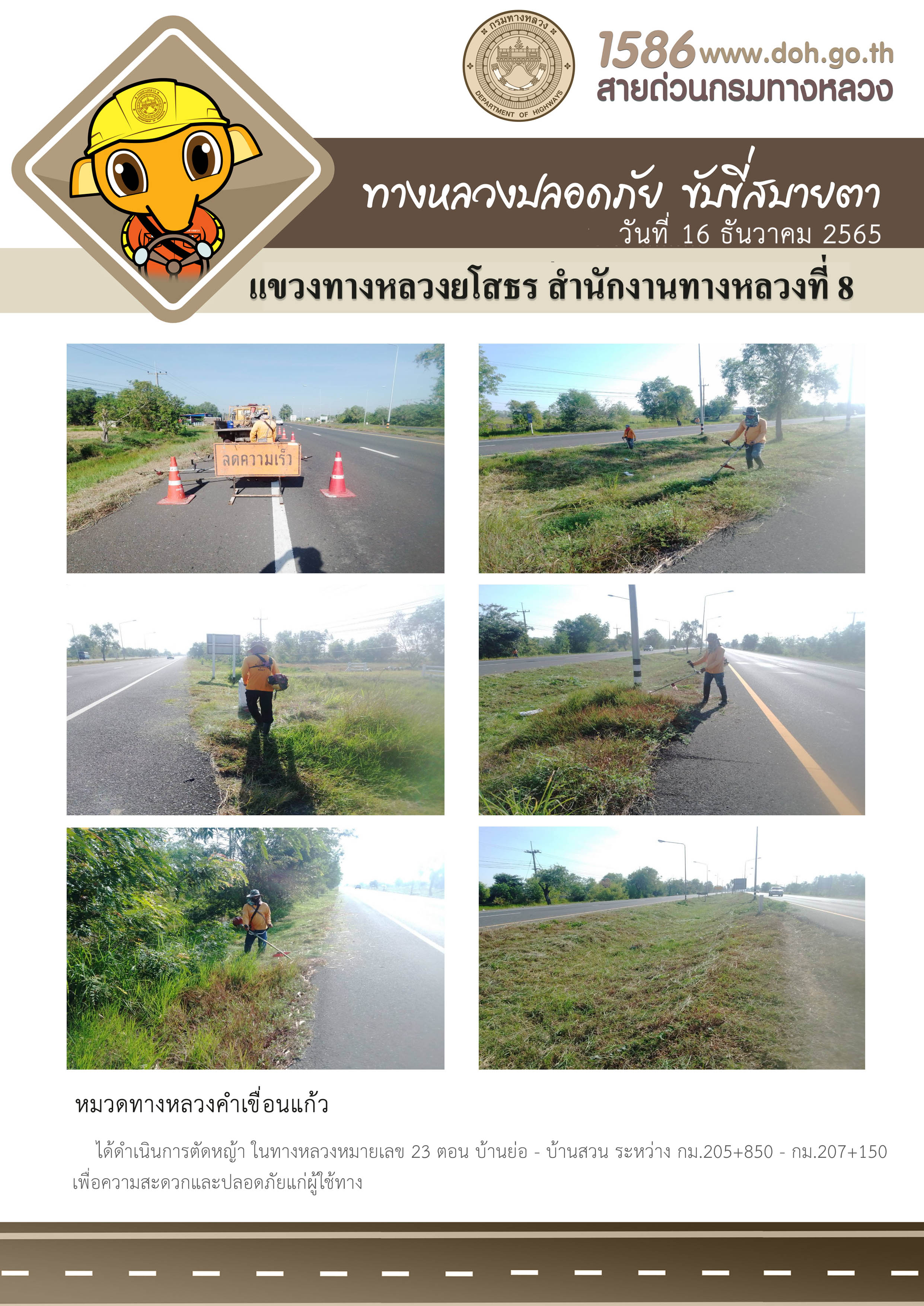 วันที่ 16 ธันวาคม 2565 หมวดทางหลวงคำเขื่อนแก้ว ได้ดำเนินการตัดหญ้า ในทางหลวงหมายเลข 23 ตอน บ้านย่อ - บ้านสวน ระหว่าง กม.205+850 - กม.207+150 เพื่อความสะดวกและปลอดภัยแก่ผู้ใช้ทาง