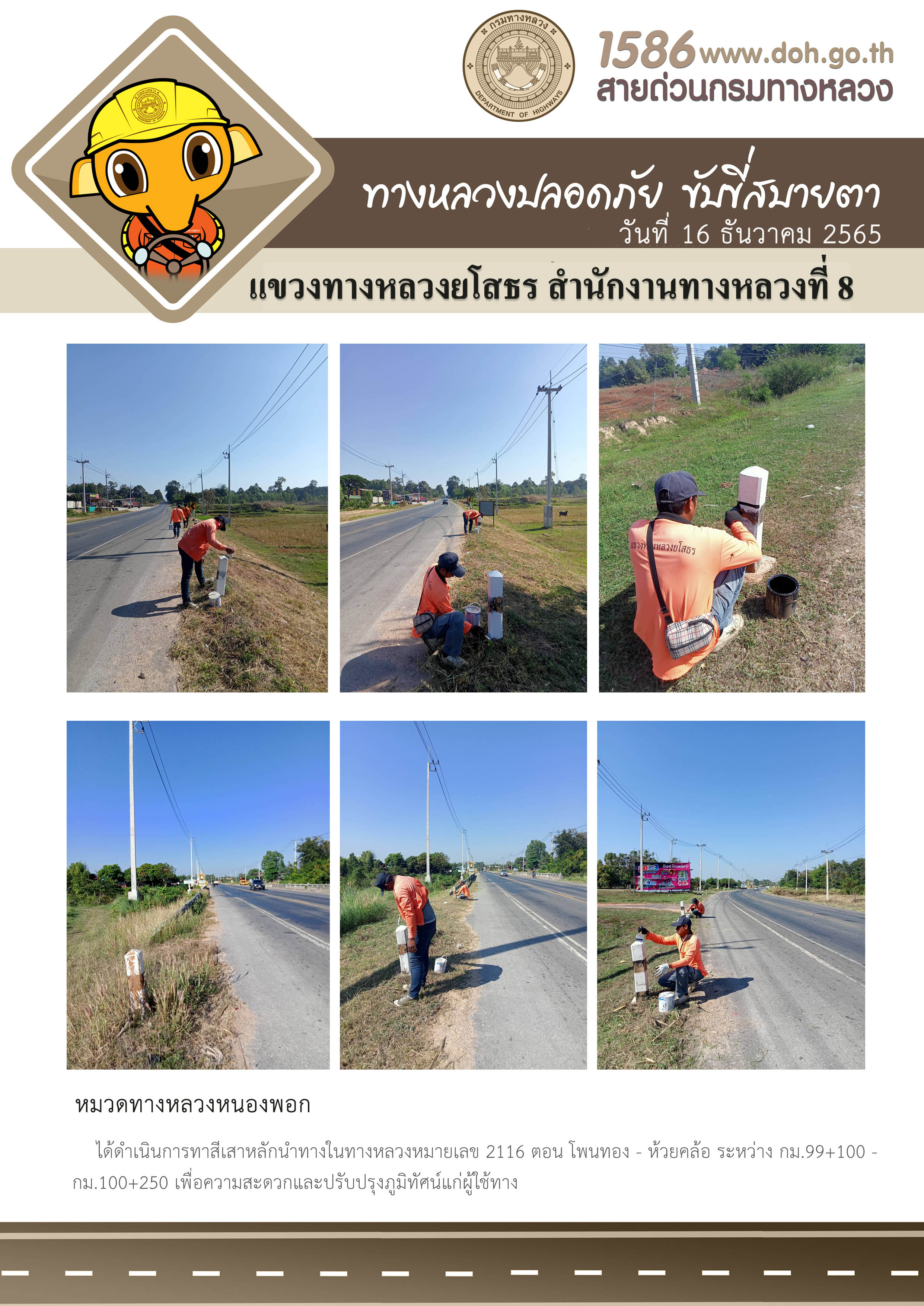 วันที่ 16 ธันวาคม 2565 หมวดทางหลวงหนองพอก ได้ดำเนินการเทสีเสาหลักนำทางในทางหลวงหมายเลข 2116 ตอน โพนทอง - ห้วยคล้อ ระหว่าง กม.99+100 - กม.100+250 เพื่อความสะดวกและปรับปรุงภูมิทัศน์แก่ผู้ใช้ทาง