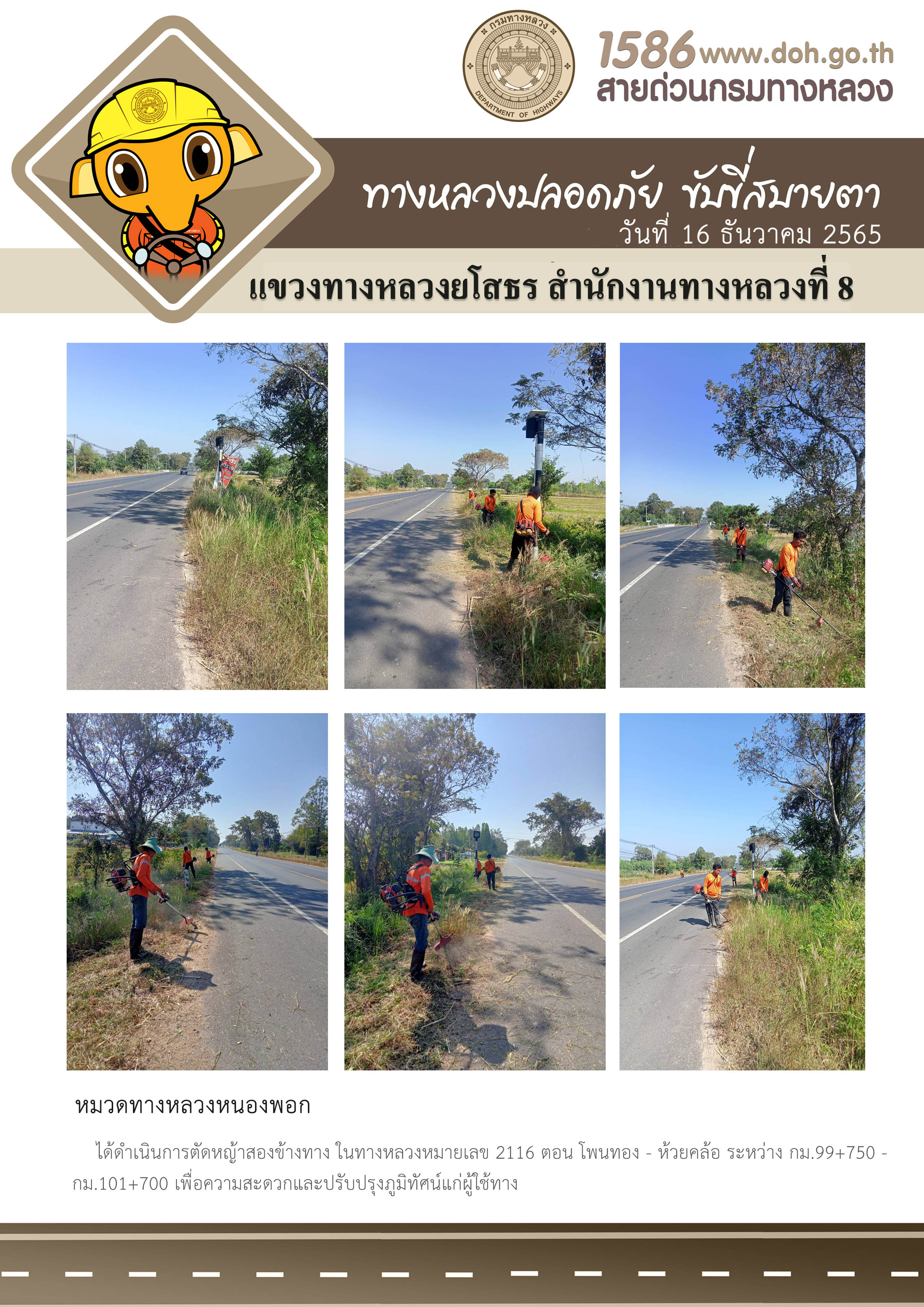 วันที่ 16 ธันวาคม 2565 หมวดทางหลวงหนองพอก ได้ดำเนินการตัดหญ้าสองข้างทาง ในทางหลวงหมายเลข 2116 ตอน โพนทอง - ห้วยคล้อ ระหว่าง กม.99+750 - กม.101+700 เพื่อความสะดวกและปรับปรุงภูมิทัศน์แก่ผู้ใช้ทาง
