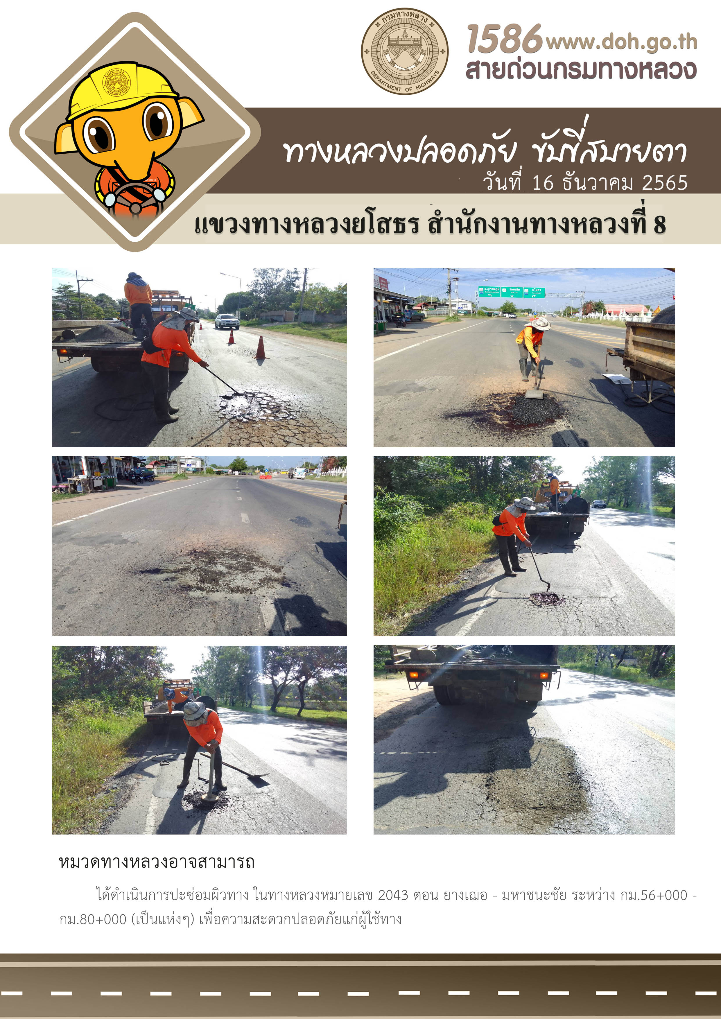 วันที่ 16 ธันวาคม 2565 หมวดทางหลวงอาจสามารถ ได้ดำเนินการปะซ่อมผิวทาง ในทางหลวงหมายเลข 2043 ตอน ยางเฌอ - มหาชนะชัย ระหว่าง กม.56+000 - กม.80+000 (เป็นแห่งๆ) เพื่อความสะดวกปลอดภัยแก่ผู้ใช้ทาง