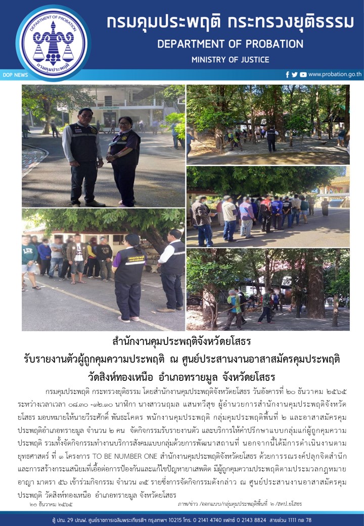 วันที่ 20 ธ.ค. 2565 (17:13 น.)กรมคุมประพฤติ กระทรวงยุติธรรม โดยสำนักงานคุมประพฤติจังหวัดยโสธร วันอังคารที่ 20 ธันวาคม 2565 ระหว่างเวลาเวลา 08.30 -12.10 นาฬิกา นางสาวนฤมล แสนทวีสุข ผู้อำนวยการสำนักงานคุมประพฤติจังหวัดยโสธร มอบหมายให้นายวีระศักดิ์ พันธะโคตร พนักงานคุมประพฤติ กลุ่มคุมประพฤติพื้นที่ 2 และอาสาสมัครคุมประพฤติอำเภอทรายมูล จำนวน 2 คน จัดกิจกรรมรับรายงานตัว และบริการให้คำปรึกษาแบบกลุ่มแก่ผู้ถูกคุมความประพฤติ รวมทั้งจัดกิจกรรมทำงานบริการสังคมแบบกลุ่มด้วยการพัฒนาสถานที่ นอกจากนี้ได้มีการดำเนินงานตามยุทธศาสตร์ ที่ 1 โครงการ TO BE NUMBER ONE สำนักงานคุมประพฤติจังหวัดยโสธร ด้วยการรณรงค์ปลุกจิตสำนึกและการสร้างกระแสนิยมที่เอื้อต่อการป้องกันและแก้ไขปัญหายาเสพติด มีผู้ถูกคุมความประพฤติตามประมวลกฎหมายอาญา มาตรา 56 เข้าร่วมกิจกรรม จำนวน 35 รายซึ่งการจัดกิจกรรมดังกล่าว ณ ศูนย์ประสานงานอาสาสมัครคุมประพฤติ วัดสิงห์ทองเหนือ อำเภอทรายมูล จังหวัดยโสธร