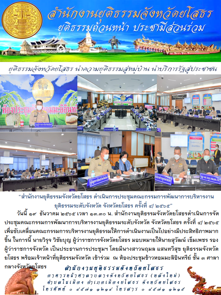 สำนักงานยุติธรรมจังหวัดยโสธร ดำเนินการประชุมคณะกรรมการพัฒนาการบริหารงานยุติธรรมระดับจังหวัด จังหวัดยโสธร ครั้งที่ 4/ 2565