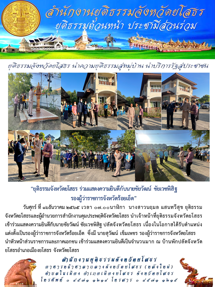 ยุติธรรมจังหวัดยโสธร ร่วมแสดงความยินดีกับนายชัยวัฒน์ ชัยเวชพิสิฐ รองผู้ว่าราชการจังหวัดร้อยเอ็ด