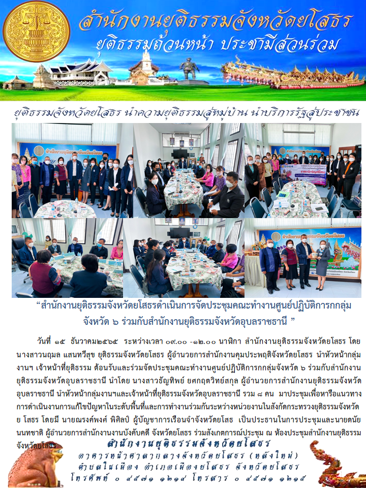สำนักงานยุติธรรมจังหวัดยโสธรดำเนินการจัดประชุมคณะทำงานศูนย์ปฏิบัติการกกลุ่มจังหวัด 6 ร่วมกับสำนักงานยุติธรรมจังหวัดอุบลราชธานี
