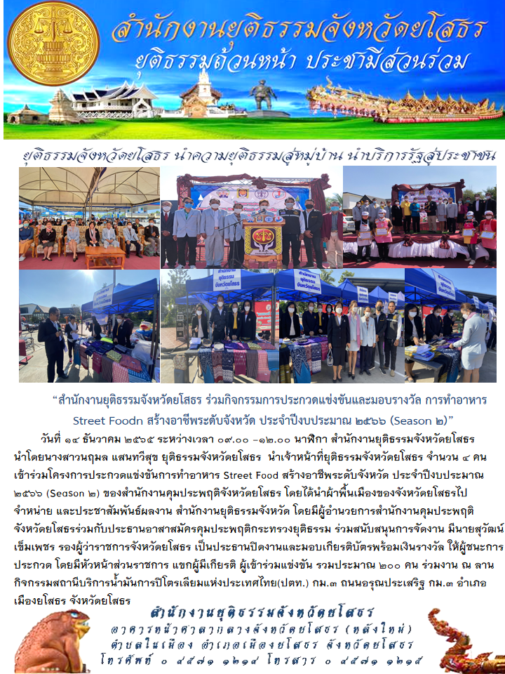สำนักงานยุติธรรมจังหวัดยโสธร ร่วมกิจกรรมการประกวดแข่งขันและมอบรางวัล การทำอาหาร Street Foodn สร้างอาชีพระดับจังหวัด ประจำปีงบประมาณ 2566 (Season 2)